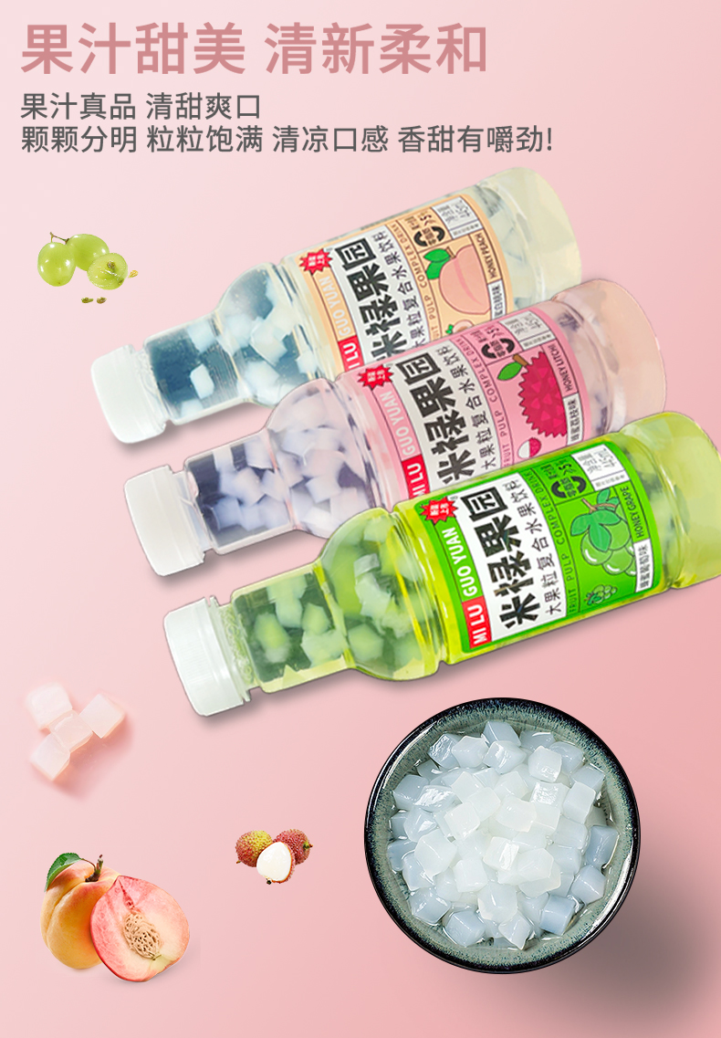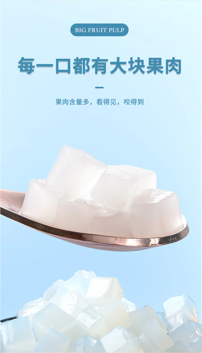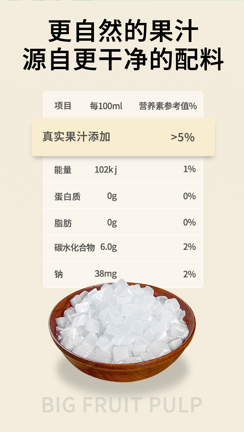 看得见的大块果肉,果汁含量≥5%,添加真实果汁,入口清爽丝滑,果粒分布均匀。