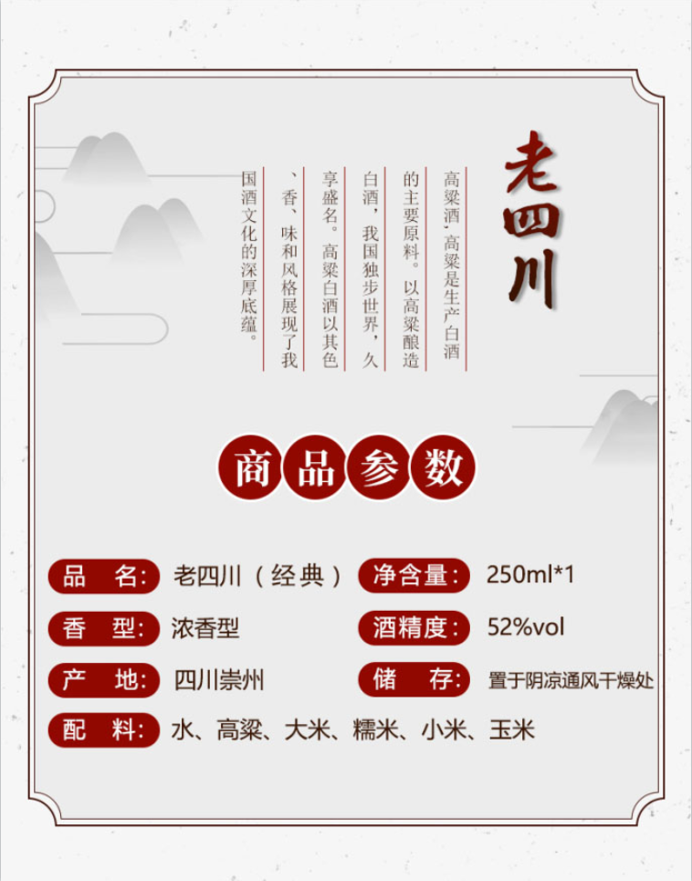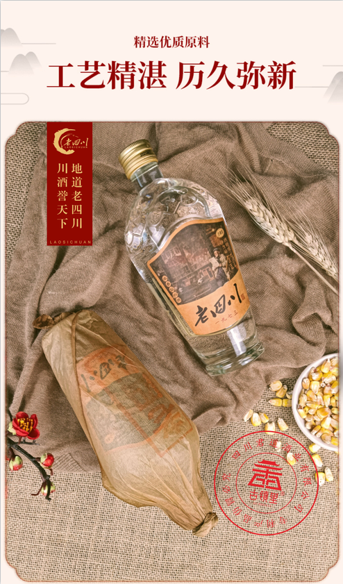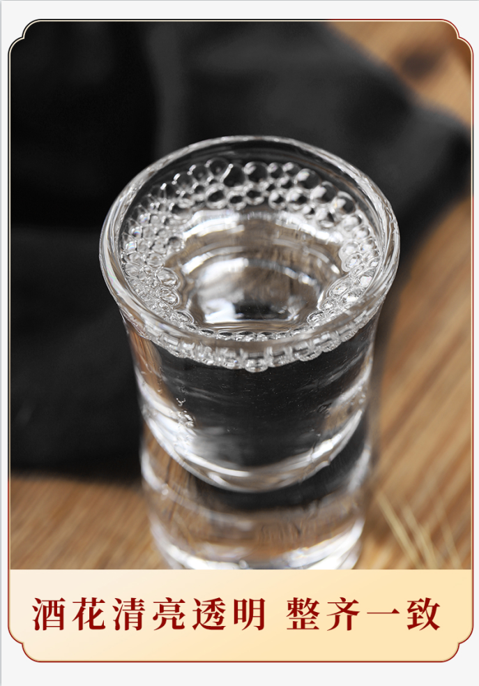 口感:酒味丰满醇厚、幽雅细腻、回味悠久、空杯留香。香气香而不艳、低而不淡、醇香幽雅、不浓不猛、回味悠长等特点,还具有倒入杯中过夜香气久留不散,且空杯比实杯还香,令人回味无穷的特性。