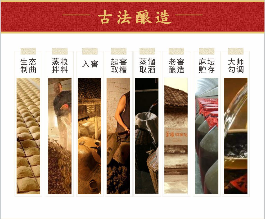 口感:酒味丰满醇厚、幽雅细腻、回味悠久、空杯留香。香气香而不艳、低而不淡、醇香幽雅、不浓不猛、回味悠长等特点,还具有倒入杯中过夜香气久留不散,且空杯比实杯还香,令人回味无穷的特性。