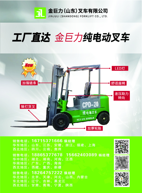 金巨力(山东)叉车有限公司是山东省内生产技术较先进的新能源电动叉车生产厂家,并且完善的售后服务能帮助客户快速解决各方面的问题,是一家较值得客户信赖的新能源电动叉车厂家之一;目前,本公司主要产品有各种规格(可以按照实际需求加工定做,直到您满意为止)的用于港口、车站、机场、货场、工厂车间、仓库、流通中心和配送中心等,在船舱、车厢和集装箱内进行托盘货物的装卸、搬运作业,是托盘运输、集装箱运输中必不可少的设备及配件,并以过硬的产品质量及合理的产品价格,多年来与客户建立了良好的合作关系,并受到市场客户的良好赞誉。