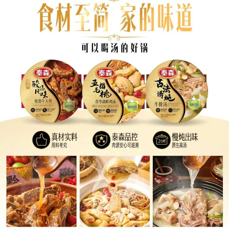 产品介绍暖锅系列是泰森食品为中国味蕾量身定制的“暖冬礼物”,五指毛桃茯苓清鲜鸡汤,淡淡椰香渗进鸡肉每一丝肌理,喝一口,是岭南山水般的清润甘甜;贵州酸汤风味吮指牛大骨,酸得明亮,辣得温柔,大骨上的肉轻轻一嗦就脱骨,仿佛舌尖去了一趟黔东南,带回一身通透暖意;古法清炖牛骨汤,时间熬出的诚意,最简单也最考验功夫。清澈汤底里藏着浓缩的牛肉原香,喝完不口干,暖意从胃蔓延到指尖。