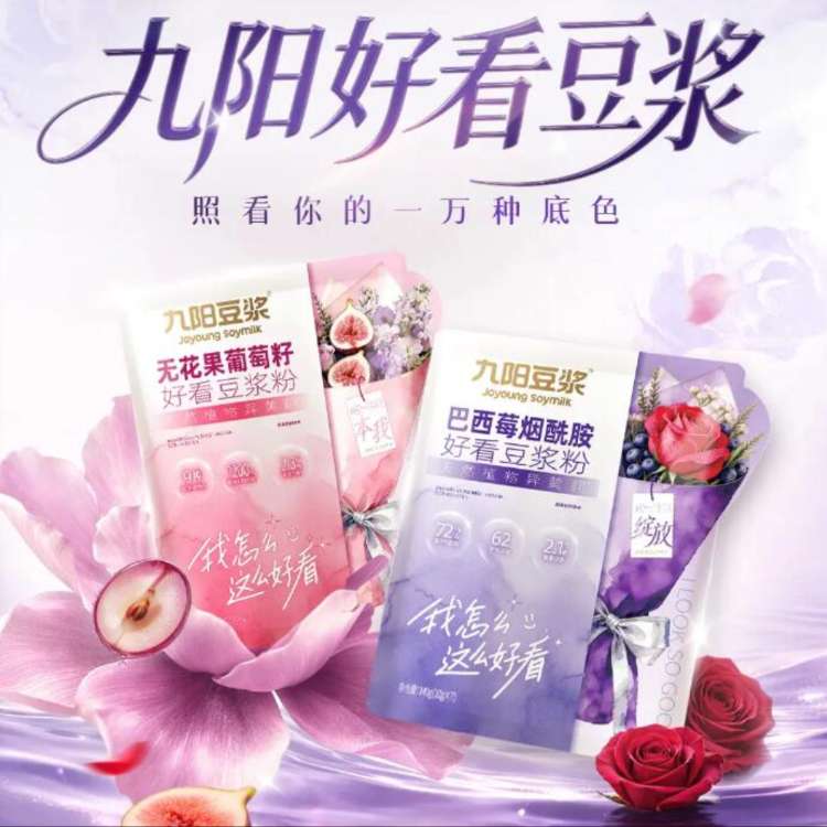 产品介绍「无花果葡萄籽 好看豆浆」选用非转基因东北大豆、俄罗斯亚麻籽、威海青皮冻干无花果、法国葡萄籽提取物、四川黑桑葚、江西黑芝麻、进口鹰嘴豆、新疆南瓜籽和广西粉葛九种食材,含大豆异黄酮(含量约为650mg/1kg)与α-亚马酸(含量≥1200mg/100g),蛋白质含量为27g/100g,膳食纤维含量为9g/100g,热量为86kcal/条,口感清香;「巴西莓烟酰胺 好看豆浆 」选用非转基因东北大豆、云南重瓣红玫瑰、威海青皮冻干无花果、俄罗斯亚麻籽、巴西莓粉等食材,含大豆异黄酮(含量约为600mg/1kg)与72%NRV烟酰胺,蛋白质含量为25.5g/100g,膳食纤维含量为9g/100g,热量为62kcal/条。