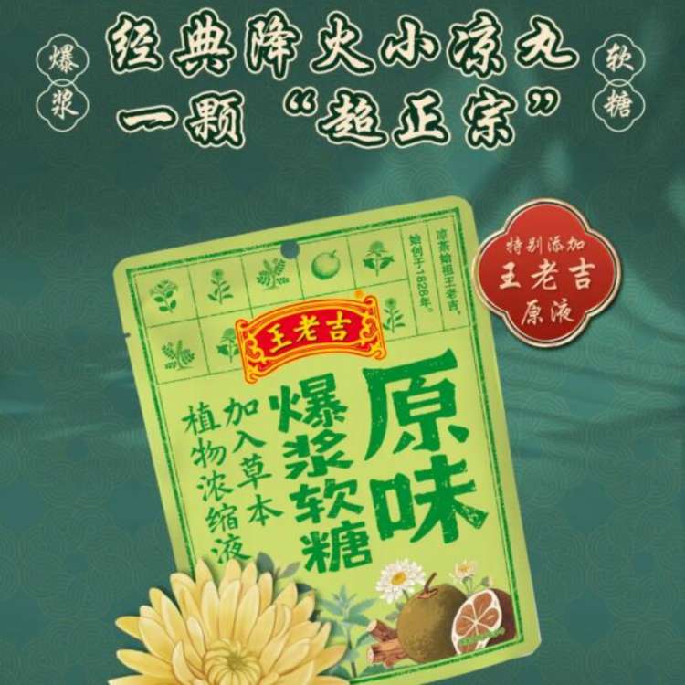 产品介绍王老吉爆浆软糖,可以嚼着吃的凉茶。原味爆浆软糖,回归最纯粹的本草本味,没有复杂的口味修饰,只有干净的回甘 ,三重口感,一口爆浆。金银花爆浆软糖,不是用香精调出“金银花味”,而是真正添加了金银花提取液。真材实料,草本入芯。每颗软糖的爆浆夹心中,融入草本浓缩精华。入口先是微微的果香,后味带有金银花独特的清润回甘,不苦不涩,是刚刚好的草本清爽。维C柠檬味爆浆软糖,每粒添加维生素C,增强免疫力,日常补充营养。酸甜比经过测评,达到“黄金酸甜比”,够酸,但不刺;够甜,但不腻。