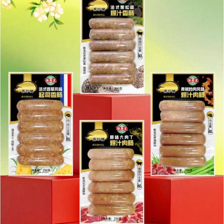 产品介绍肉质丰盈,口感扎实。法式黑松露爆汁香肠,甄选猪腿肉、黑松露,猪肉含量≥80%。香气层次丰富,咬开瞬间,黑松露菌香漫开,搭配扎实肉块,口感浓郁不腻。法式香草风味 起司香肠,芝士融化后带来细腻奶香,香草风味清新平衡口感,每一口都是意想不到的融合惊喜。原味大肉丁爆汁肉肠,真实大块肉丁,简单调味突出肉香,没有复杂调味,肉香四溢。青椒炒肉风味爆汁香肠,微微辣意激发食欲,线椒清香突出。