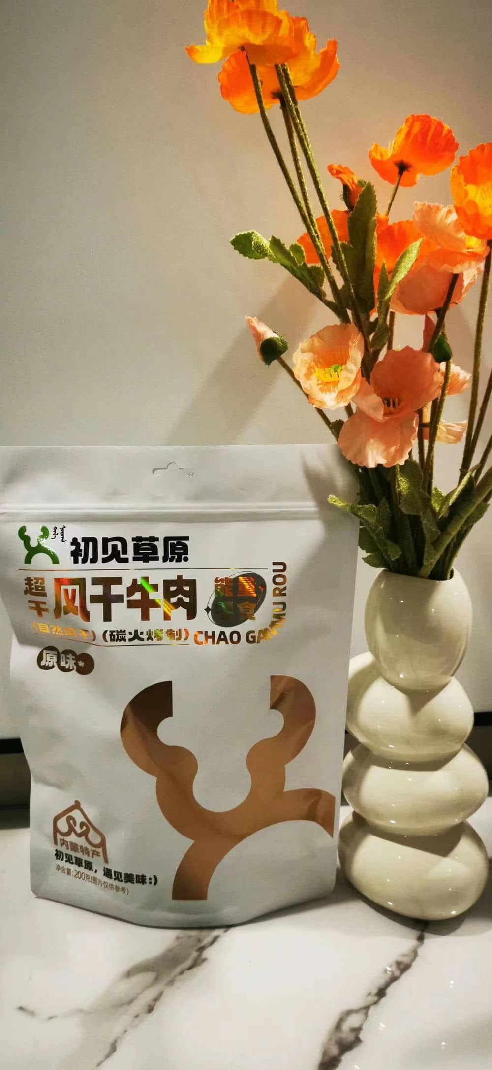 采用内蒙古黄牛后腿肉,传统工艺腌制、自然风干、炭火烤制、9层以上干