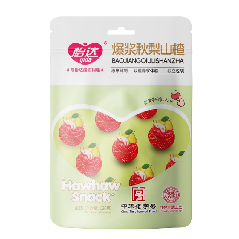 1.山楂全部来自燕山山脉的 铁山楂,产地温差大,山楂质密,果胶含量高,山楂新鲜采摘后经过怡达非遗工艺金楂六法(鲜、洗、煮、浸、 筛、冷)六个环节,六道活水清洗,全程低温工艺,锁住原果营养。烹煮+浸味时间长达 18个小时,入味足。