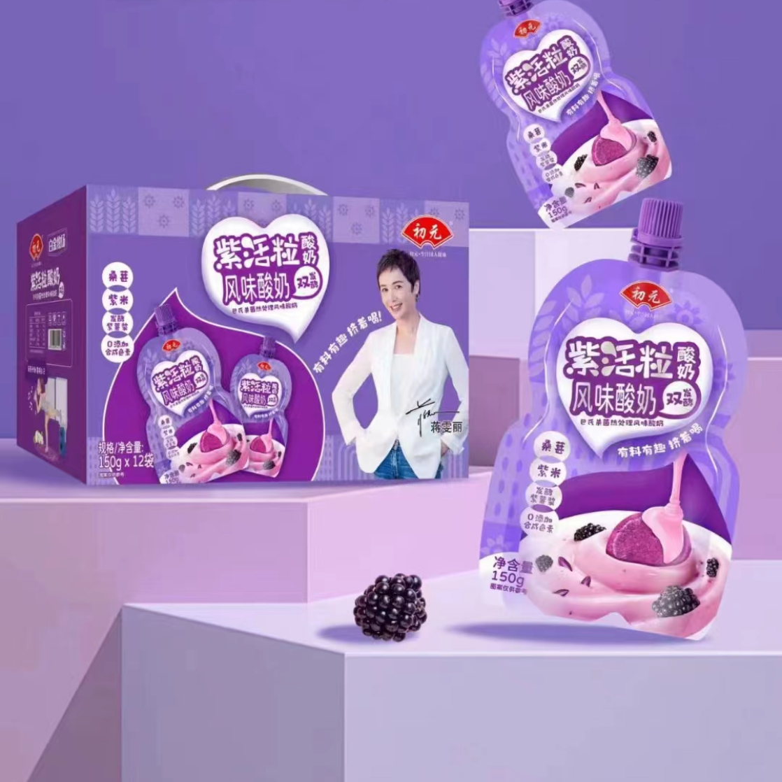 紫薯桑葚口味酸奶:1、0添加色素 2、双发酵(发酵紫薯泥)。