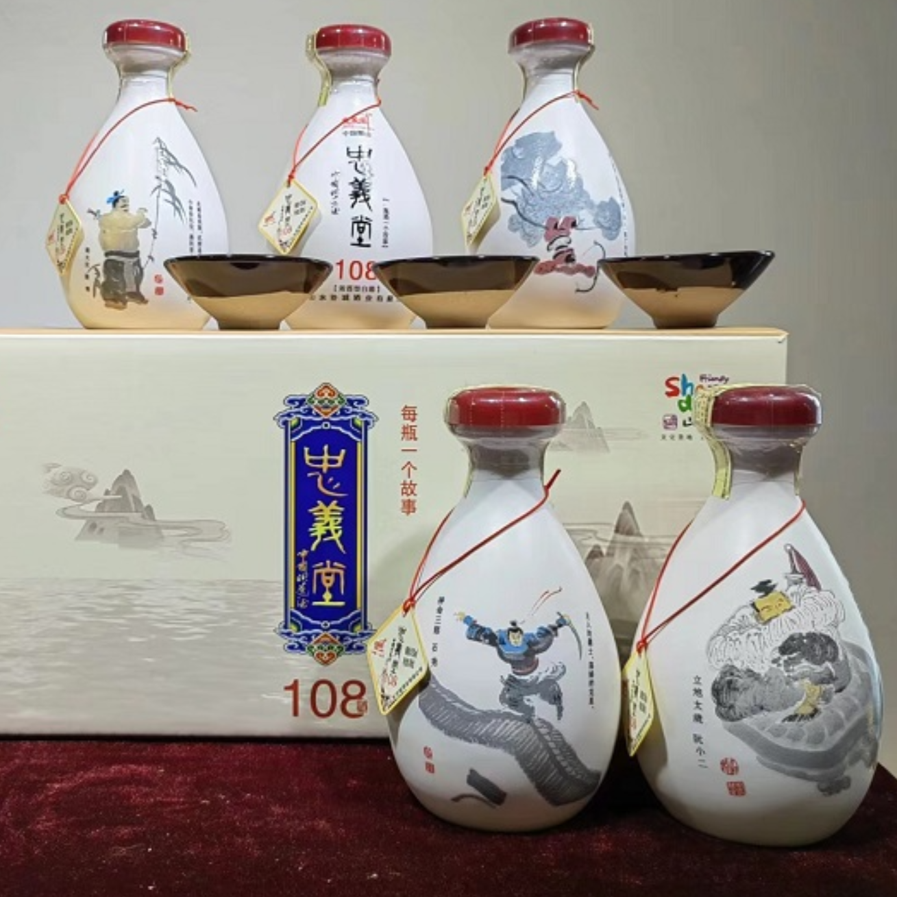 本产品采用非遗手工酿造工艺,采用山东大红高粱、小麦、大麦为原料,口味绵柔净爽、回味悠长、具有好喝***的特点;本产品与水浒108将英雄人物相结合,故事人物以王世会老师108将作品人物为原型,每瓶一个人物,每瓶一个故事,每瓶一句话总结人物的一生,是一款具有文化价值和收藏价值的好酒。喝水浒人物酒,做天下真英雄!