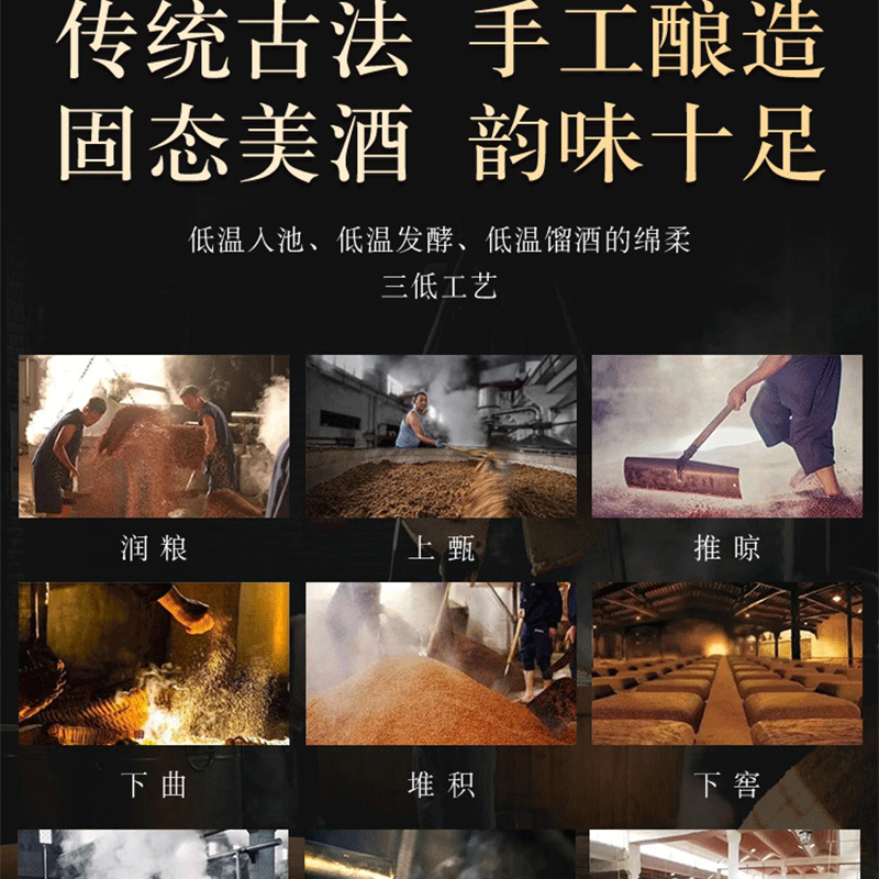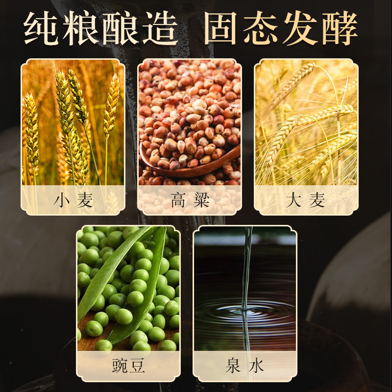 - 纯粮酿造,原料只有水、高粱、大麦、小麦、豌豆;