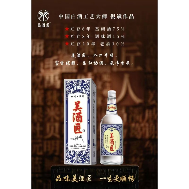 当复古的包装与醇厚的口感相遇,便诞生了美酒匠这款令人陶醉的佳酿 这款酒包装复古 一下带你穿越回那个质朴又充满情怀的年代 拿起美酒匠,瓶身的设计简约大方,经典的元素让人一眼就难以忘怀 由中国白酒工艺大师、四川酿酒大师倪斌先生及其团队匠心酿造 选用贮存6年以上基础酒75% 8年以上的调味酒15% 10年以上老酒10% 调制而成 口感上有着独特的魅力 入口平顺 窖香优雅 柔和协调 尾净香长 在忙碌的生活中 不妨停下脚步 倒上一杯美酒匠 让那醇厚的口感和浓郁的香气带您放松身心 畅享美好时光