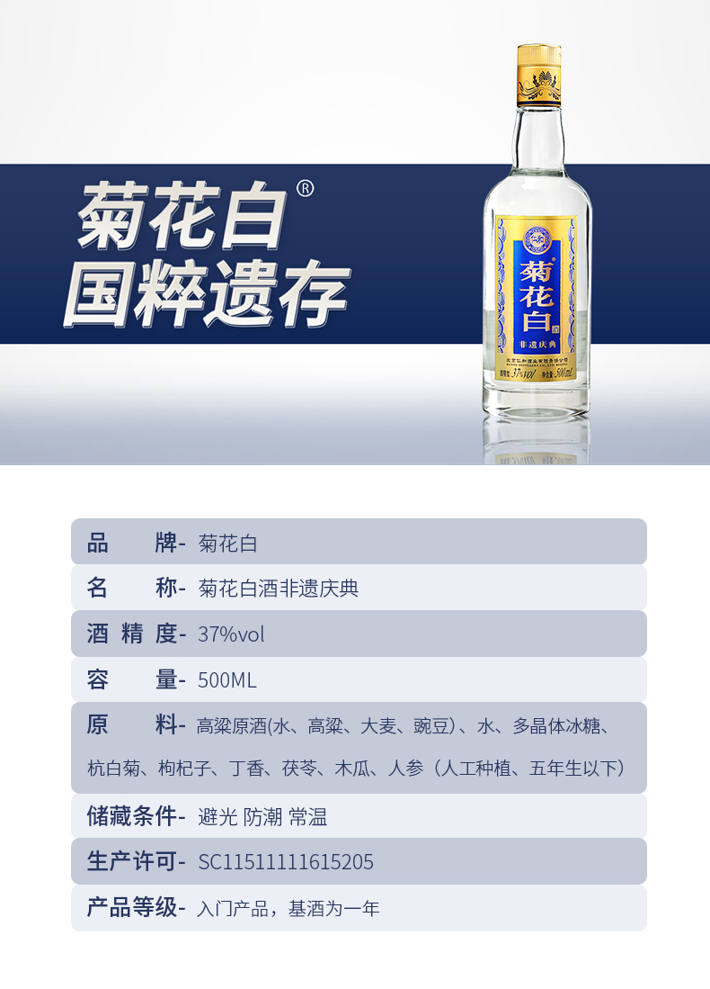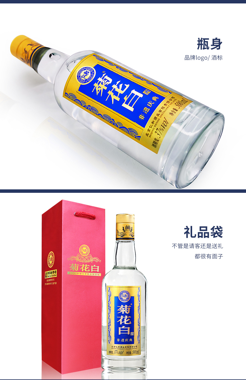 1.酿造工艺:零外采基酒。采用本厂自酿南路烧酒,用特制蒸馏釜直接蒸出所需度数,过程中无需加浆降度。作为皇家用酒,菊花白前后需要经过三次蒸馏,去除了大量甲醇、杂醇及醛类物质。甲醇杂醇含量<0.01克,远低于每一升酒甲醇含量不得超过0.6克的国家标准。这也正是菊花白酒醉得慢,醒得快,还可以冰饮的原因。