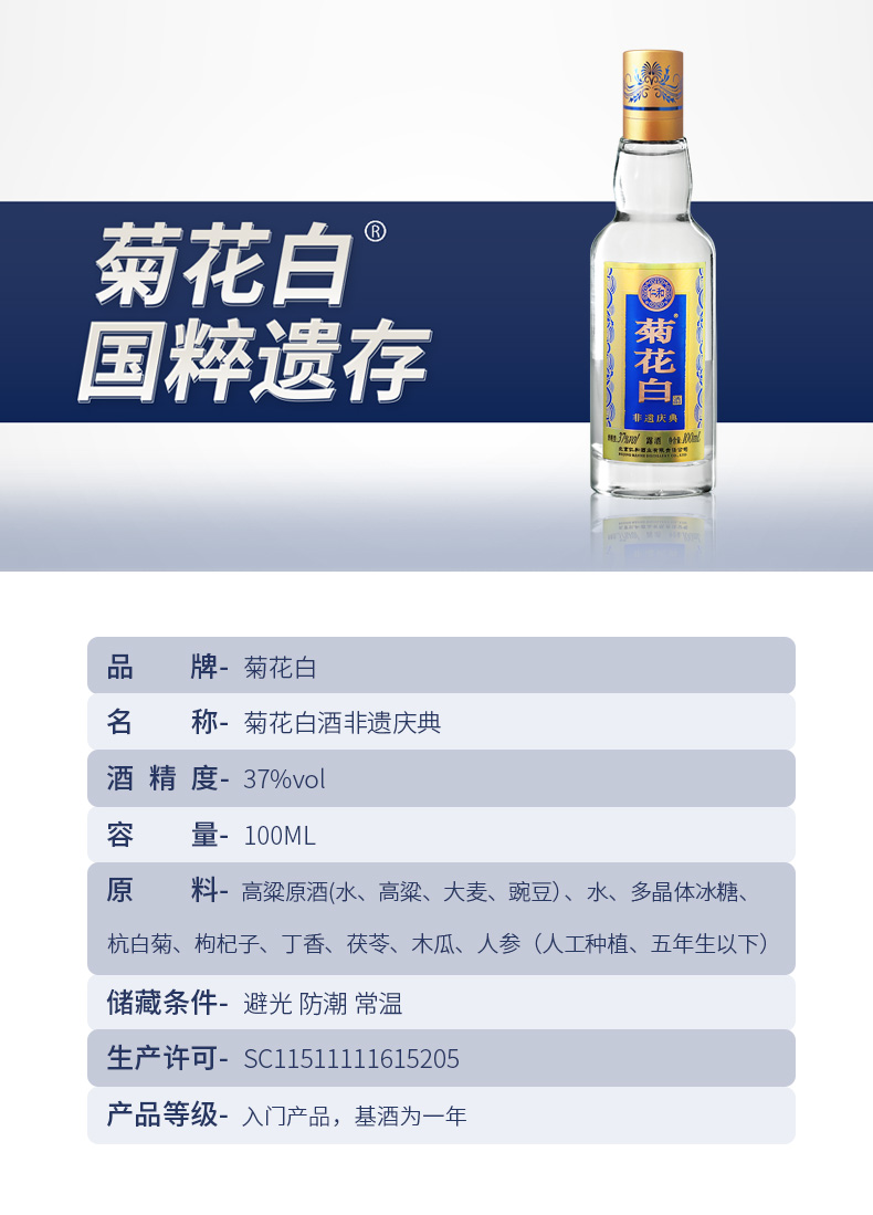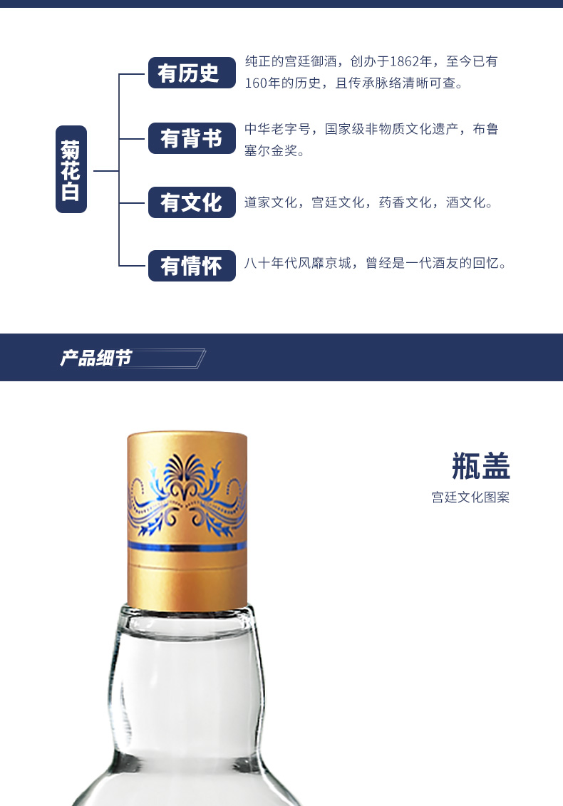 1.酿造工艺:零外采基酒。采用本厂自酿南路烧酒,用特制蒸馏釜直接蒸出所需度数,过程中无需加浆降度。作为皇家用酒,菊花白前后需要经过三次蒸馏,去除了大量甲醇、杂醇及醛类物质。甲醇杂醇含量<0.01克,远低于每一升酒甲醇含量不得超过0.6克的国家标准。这也正是菊花白酒醉得慢,醒得快,还可以冰饮的原因。