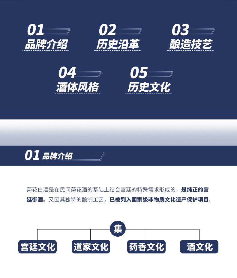 4.传承脉络:菊花白酒,源产于故宫酒醋房,后几个老太监辗转出宫,创办仁和号,传承脉络清晰可查。当年爱新觉罗·溥杰先生亲自品尝鉴定,口感与宫中的完全相同。