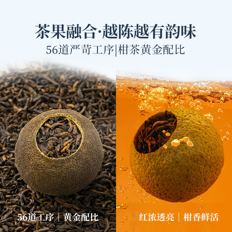 精选澜沧江流域多个古茶山宫廷级熟茶原料,经5年原产地优质藏养,再调入熟普,芽毫含量和原料精细度,多次调试成为茶底原料,与新会核心产区优选柑果,历经 56 道工序精制而成。成品圆润小巧,柑皮墨绿油润,油室眼密集、大而凹入、分布均匀;熟茶陈甜香与柑皮清新果香自然融合,香气浓郁,清新怡人,汤香饱满,冷香持久;汤色红浓透亮;茶汤稠滑,口感醇甜,清爽甘润,生津持久,韵味悠长;茶底红褐,肥嫩柔软。熟普与柑皮在香气口感上高度融合,独显韵味。