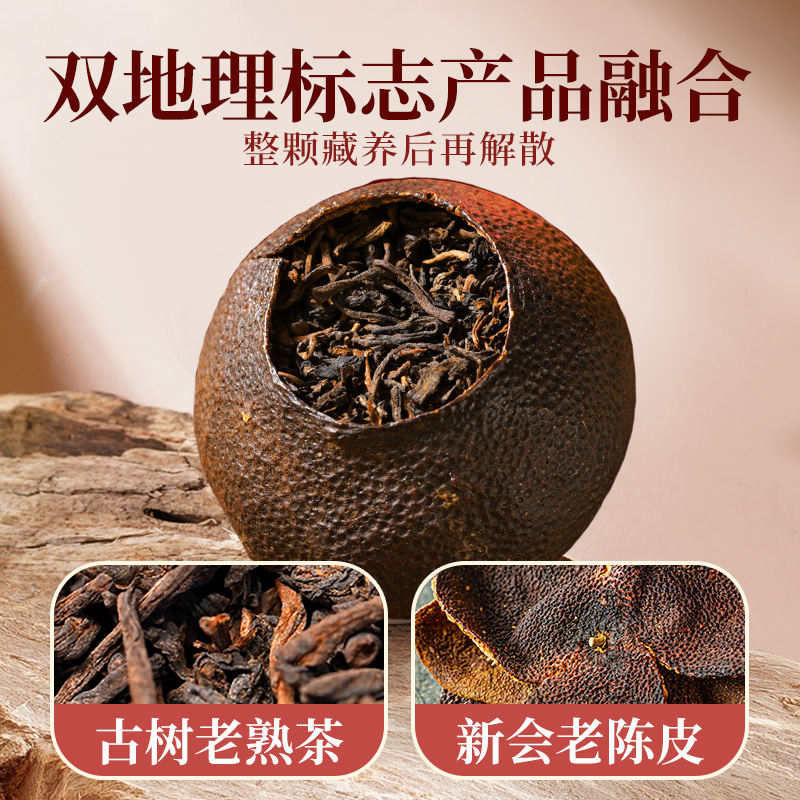 【产品简介】澜沧古茶红柑普洱,精选澜沧江流域多个古茶山熟茶原料,精研茶原料配方,与新会核心产区优选甜熟大红柑果结合,历经严苛标准精制而成单颗半成品,在2015年融合藏养十年后,人工解散按固定茶皮比例解散后装袋,确保高品质。