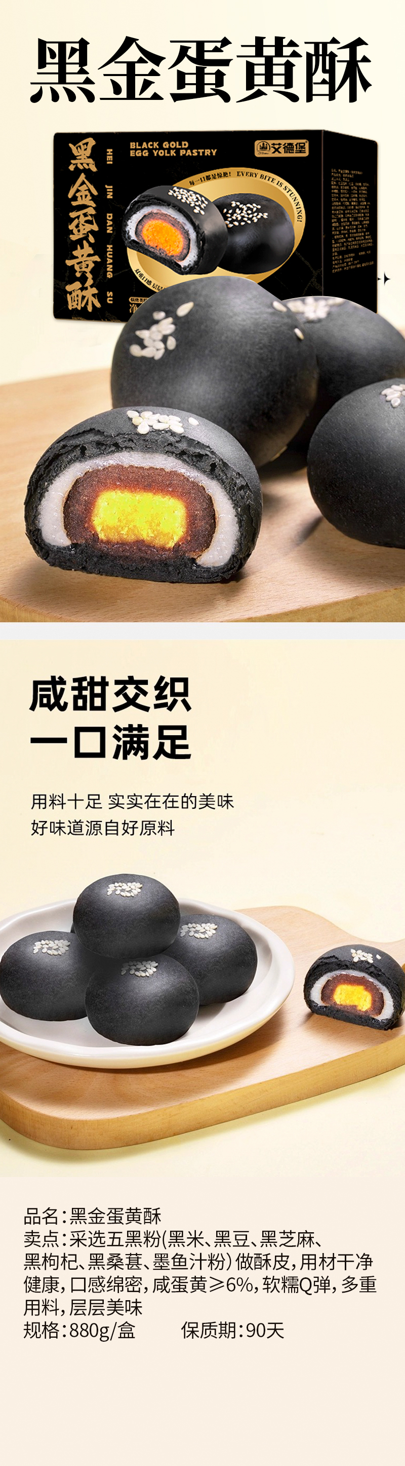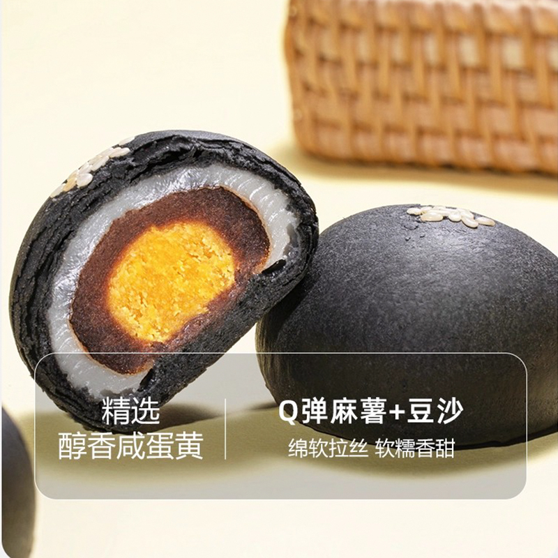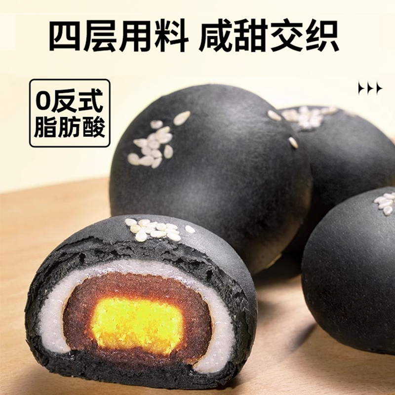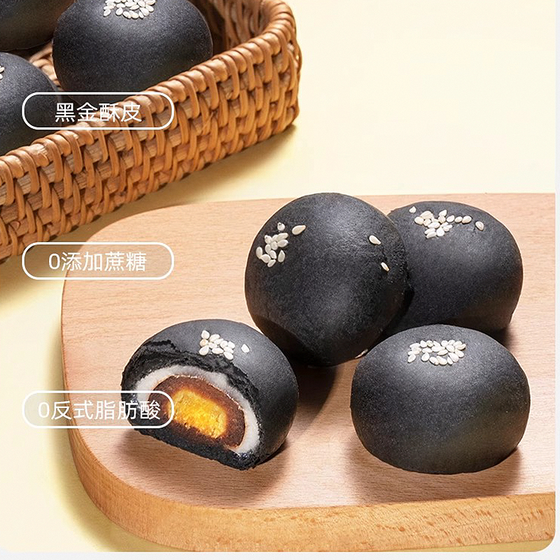 采选五黑粉(黑米、黑豆、黑芝麻、黑枸杞、黑桑葚、墨鱼汁粉)做酥皮,用材干净健康,口感绵密,咸蛋黄≥6%,软糯Q弹,多重用料,层层美味