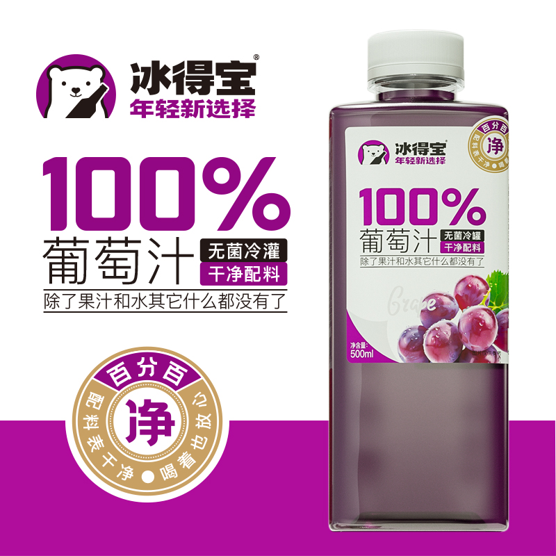 冰得宝葡萄汁是冰得宝品牌推出的一款主打天然健康的果汁饮品,延续了品牌“配料表干净”的核心优势。