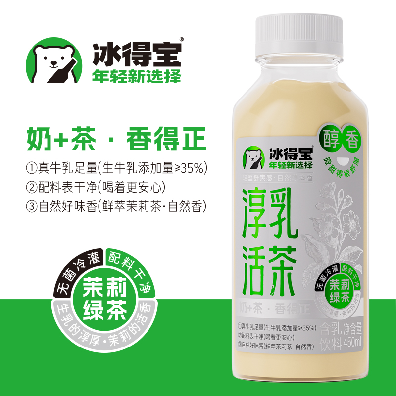 冰得宝纯乳活茶茉莉绿茶是品牌推出的一款主打“干净健康”的创新乳茶饮品,重新定义了便捷乳饮的品质标准。