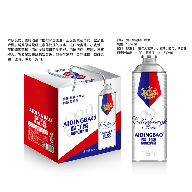 品名:爱丁堡精酿白啤酒规格:1Lx6罐配料:酿造水、进口大麦芽、小麦芽、酵母、啤酒花原麦汁浓度:11*P酒精度:≥4.5%vol
