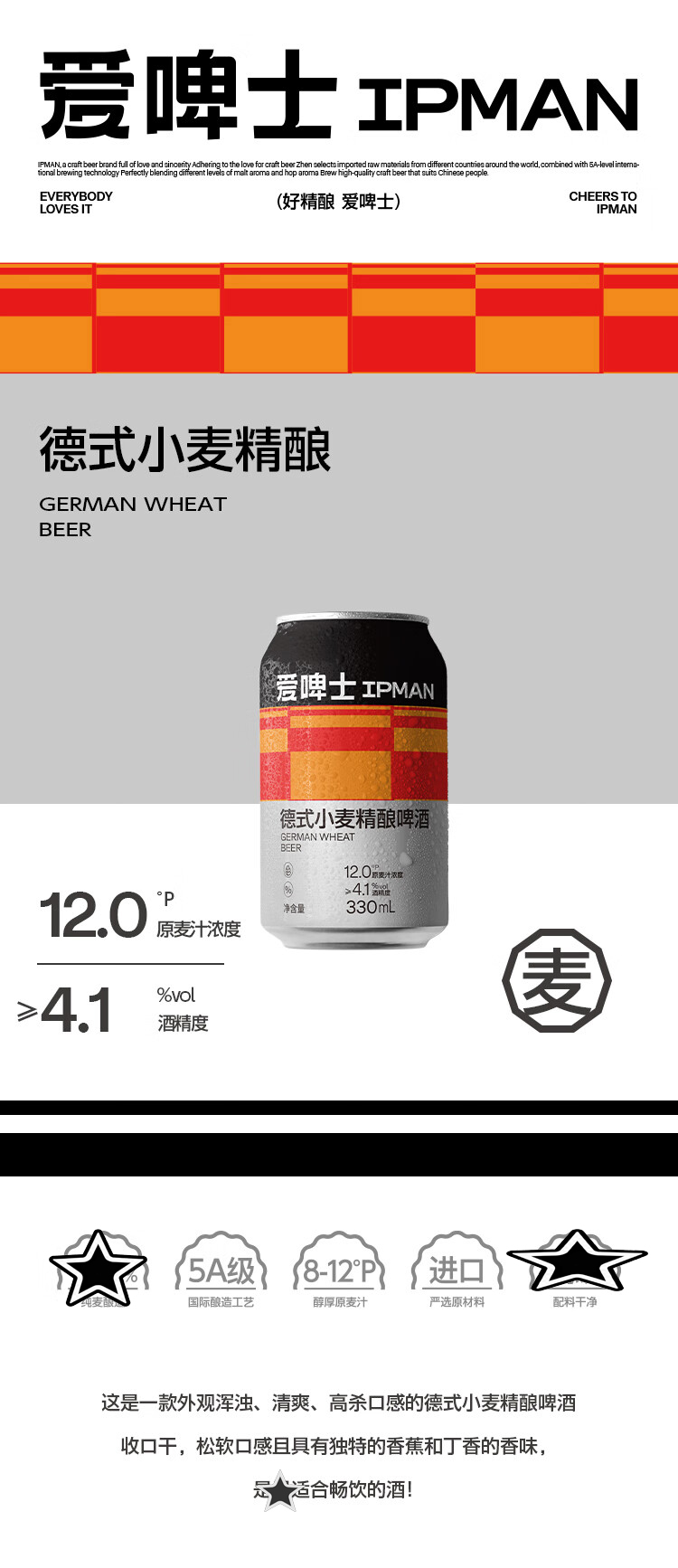 料表:水,大麦芽,小麦芽,啤酒花,酵母酒精度:≥4.1%VOL 原麦汁浓度:12°P 保质期:270天外观浑浊呈现金黄色,质感醇厚,泡沫细腻且持久,醇香的麦芽气息,高杀口感,具有独特的丁香与香蕉的气息,适合畅饮的啤酒。