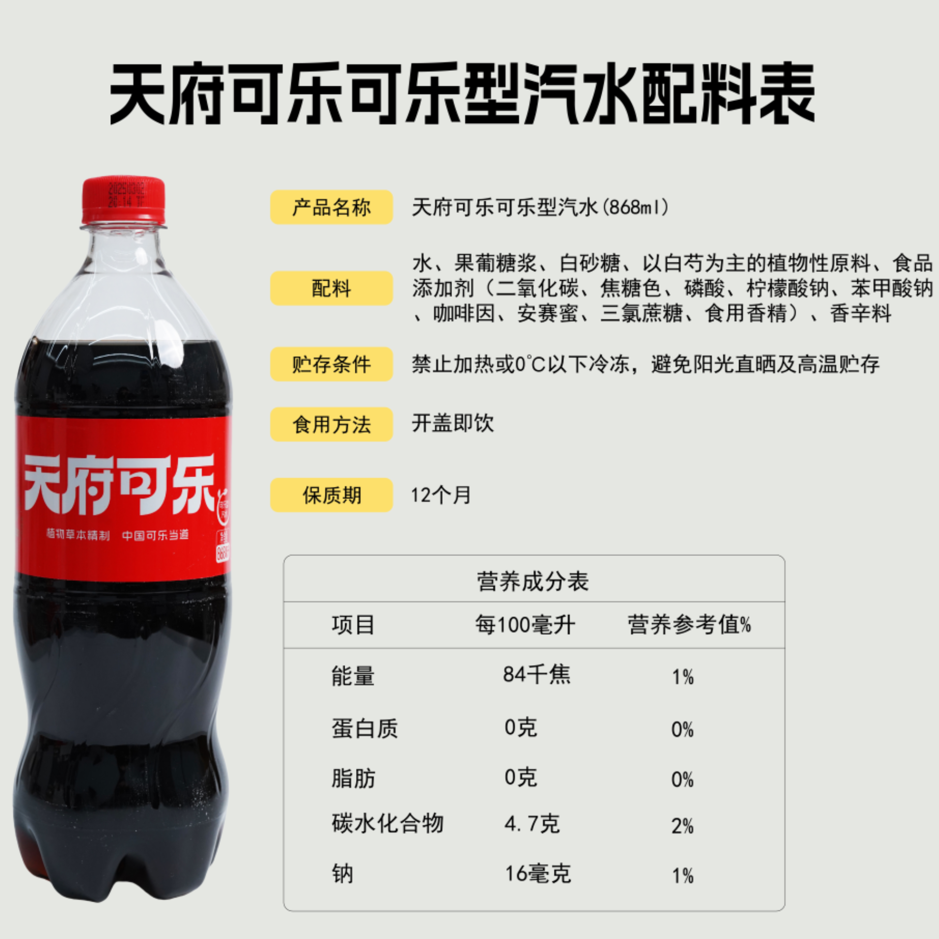 延续天府可乐草本配方,淡淡清香,畅饮清爽。容量更大,价格实惠。
