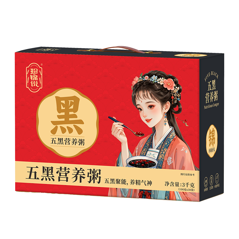配料:黑米、血糯米、黑小米、黑麦仁、燕麦米、黑豆、枣片(去核)、枸杞干、红扁豆