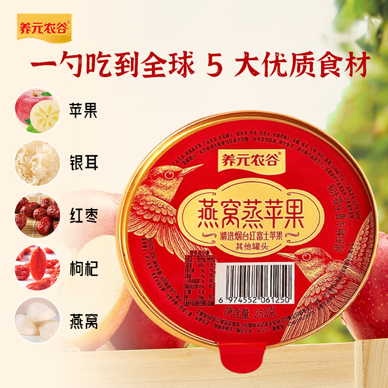 A:配料表干净,没有添加B:每一碗都有一整颗新鲜红富士苹果C:秋冬不能吃寒凉的水果的,可以吃蒸苹果D:搭配银耳、红枣、枸杞E:非代工,自有工厂,源头有保证