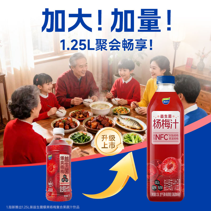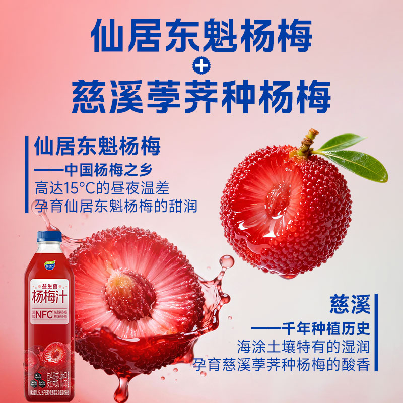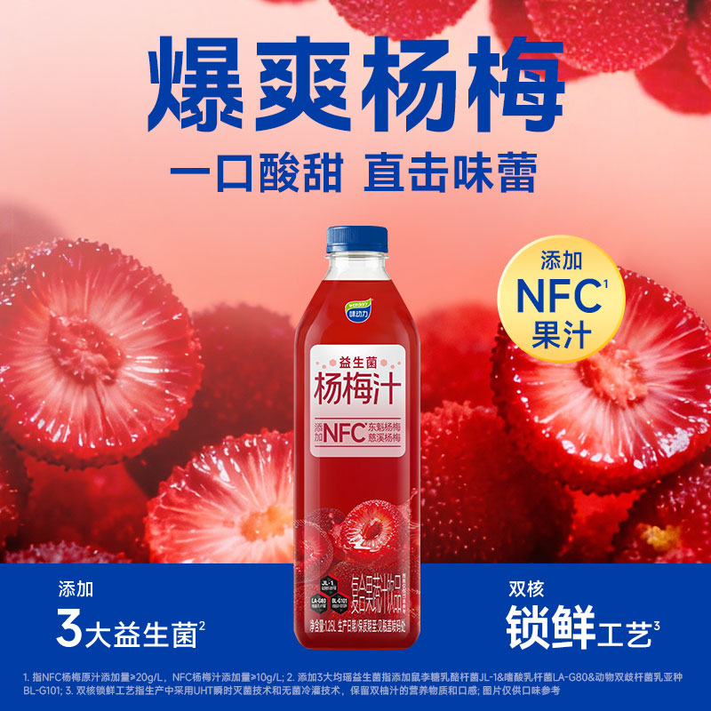 添加基石菌团Common core(即三大明星益生菌——鼠李糖乳酪杆菌JL-1、嗜酸乳杆菌LA-G80、动物双歧杆菌乳亚种BL-G101),提供营养。优选仙居东魁杨梅 × 慈溪荸荠种杨梅,双农产品地理标志,2:1比列调制,交织出清冽的酸甜口感,轻松解腻;采用UHT超高温瞬时灭菌+无菌冷罐技术工艺,留存营养,保留自然好风味。
