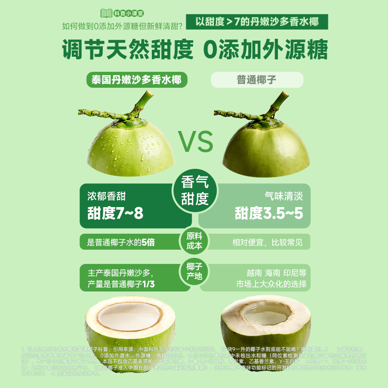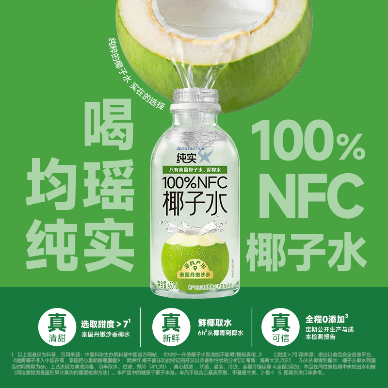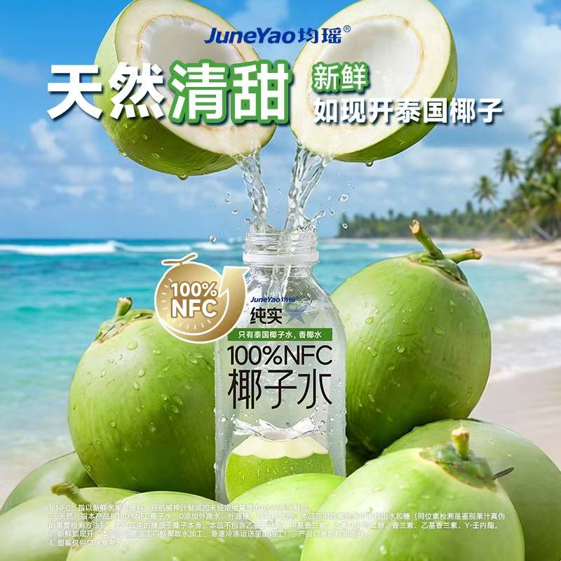 均瑶纯实100%椰子水 ,公开原料+成品检测报告的品牌,真的有泰国椰子水和泰国香椰水。源自泰国丹嫩沙多。并额外添加当地珍贵的香椰水,造就了6.5-8.5的黄金甜度,浓郁甘甜,椰香纯粹。敢检测,0添加外源水、外源糖、香精,甜味来自泰国丹嫩沙多香水椰原本甘甜;全程扫码可溯源。无菌冷罐工艺,保留椰子新鲜现开的清鲜。电解质含量224mg/mL,低糖果汁选椰汁,轻负担更安心。