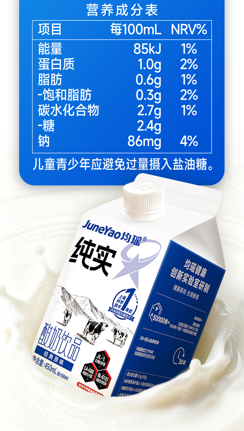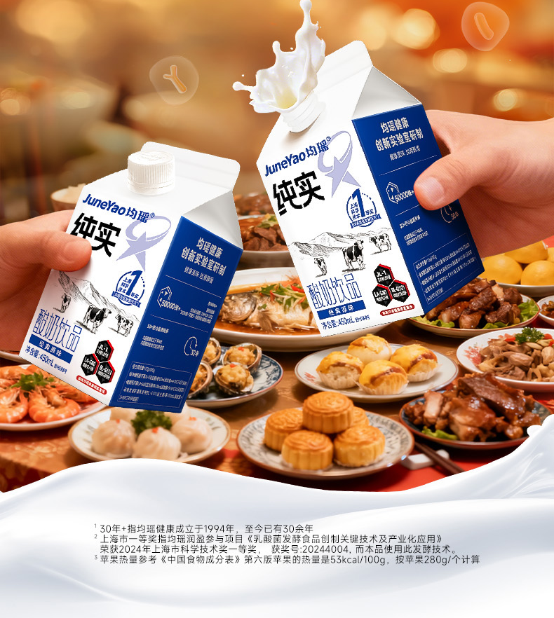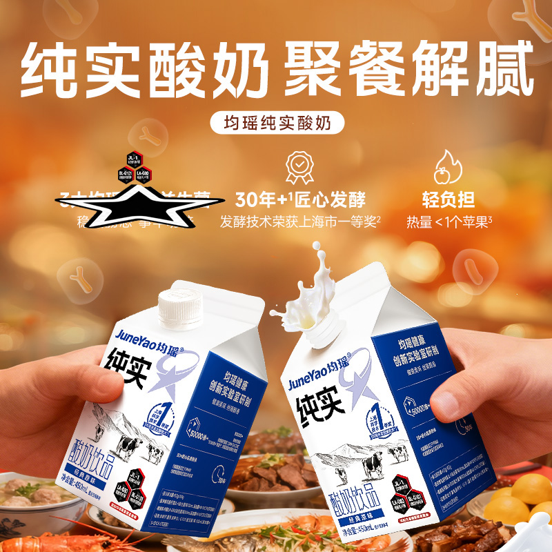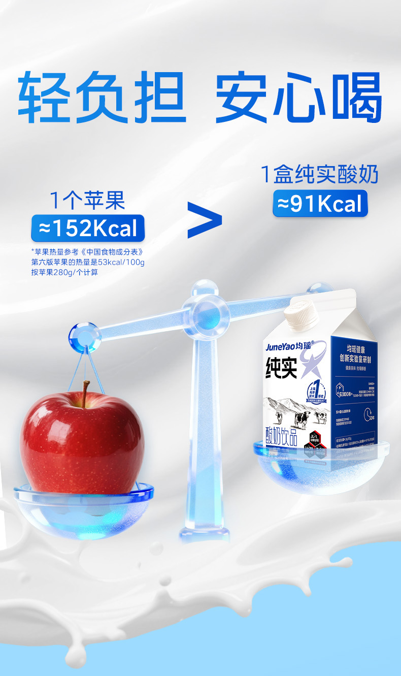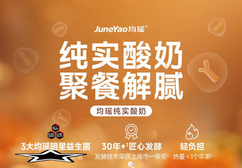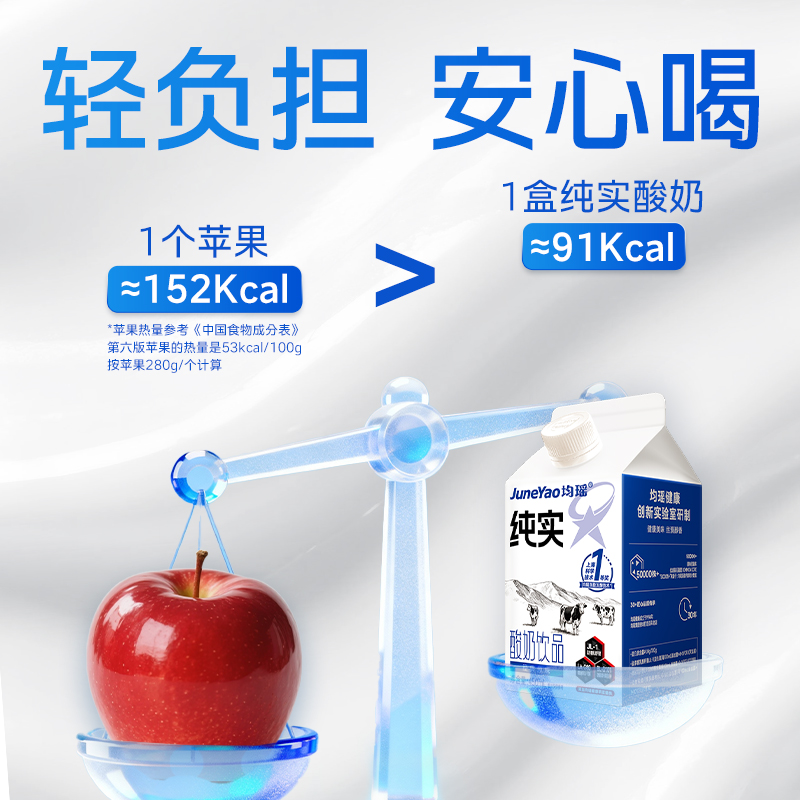 均瑶纯实酸奶 均瑶酸奶,聚餐解腻真发酵、真醇香、真营养。添加基石菌团Common core(即三大明星益生菌——鼠李糖乳酪杆菌JL-1、嗜酸乳杆菌LA-G80、动物双歧杆菌乳亚种BL-G101)。添加均瑶润盈明星发酵剂GF23111,42℃黄金温度,抑制杂菌发酵,5小时高效产酸至4.5PH,高效协助乳糖分解乳酸。轻负担,安心喝,1盒热量约等于91Kcal,远小于1个苹果(≈152Kcal)。