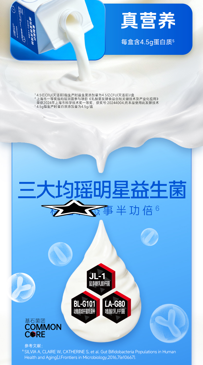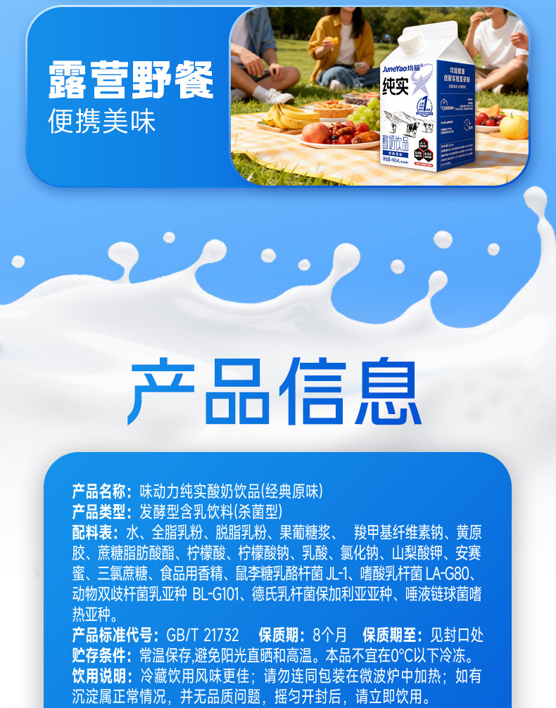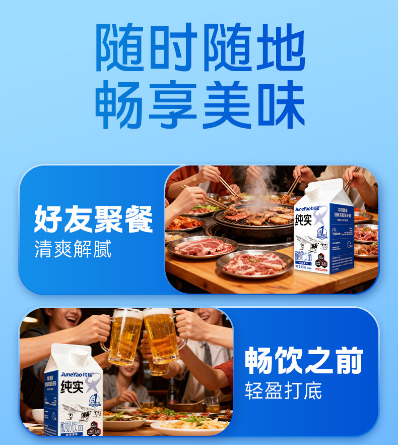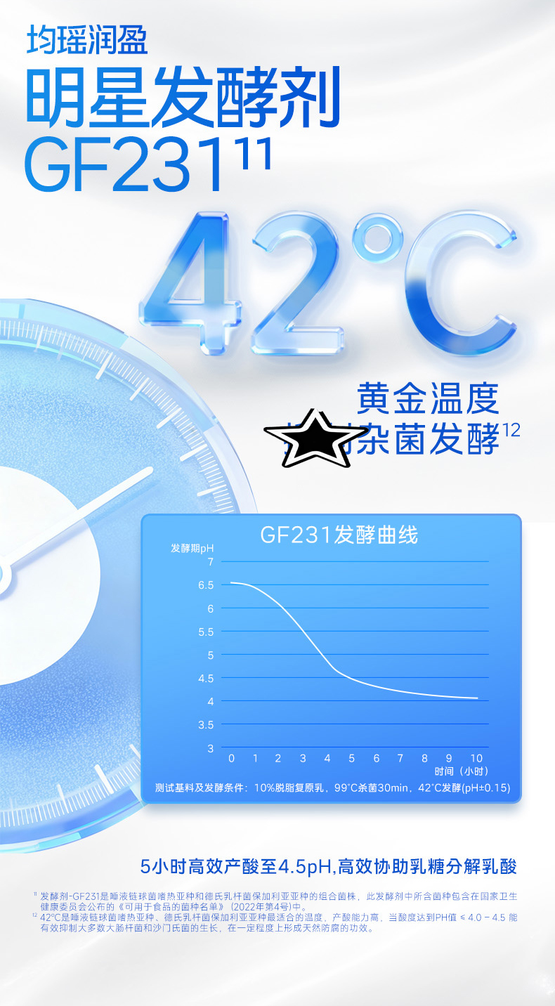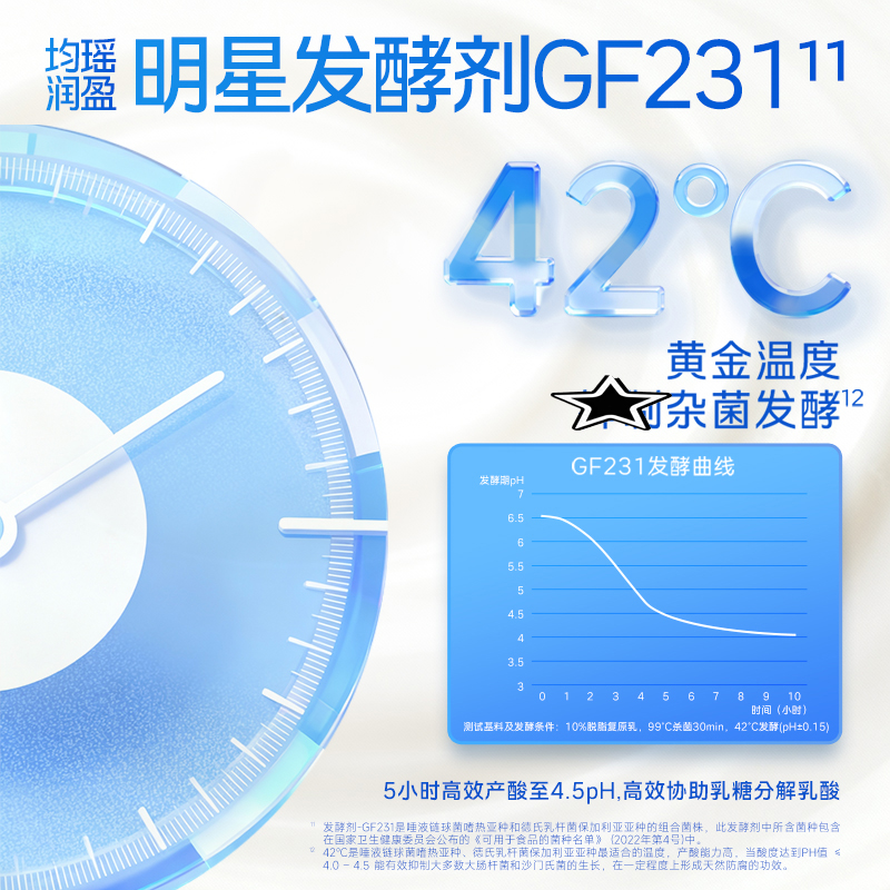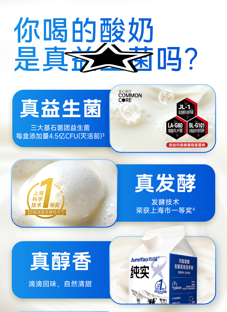 均瑶纯实酸奶 均瑶酸奶,聚餐解腻真发酵、真醇香、真营养。添加基石菌团Common core(即三大明星益生菌——鼠李糖乳酪杆菌JL-1、嗜酸乳杆菌LA-G80、动物双歧杆菌乳亚种BL-G101)。添加均瑶润盈明星发酵剂GF23111,42℃黄金温度,抑制杂菌发酵,5小时高效产酸至4.5PH,高效协助乳糖分解乳酸。轻负担,安心喝,1盒热量约等于91Kcal,远小于1个苹果(≈152Kcal)。