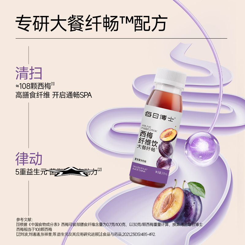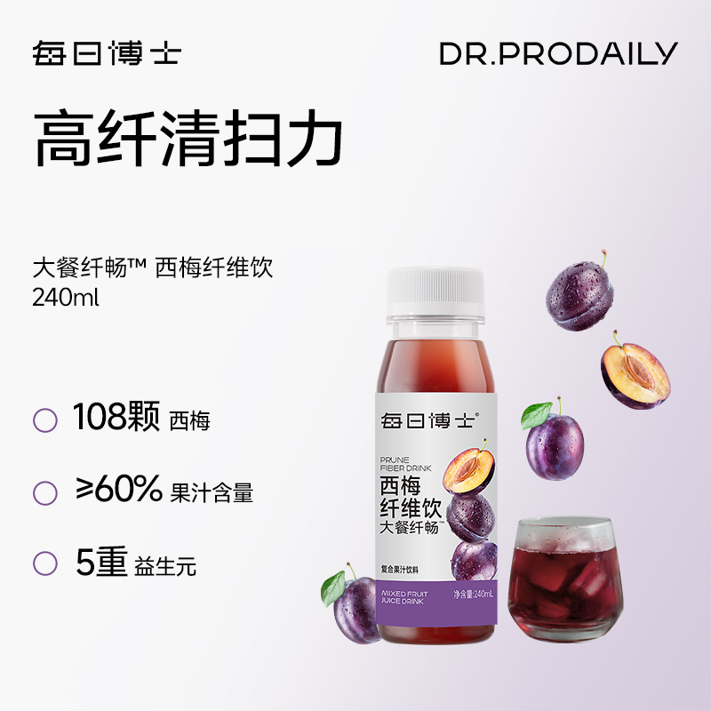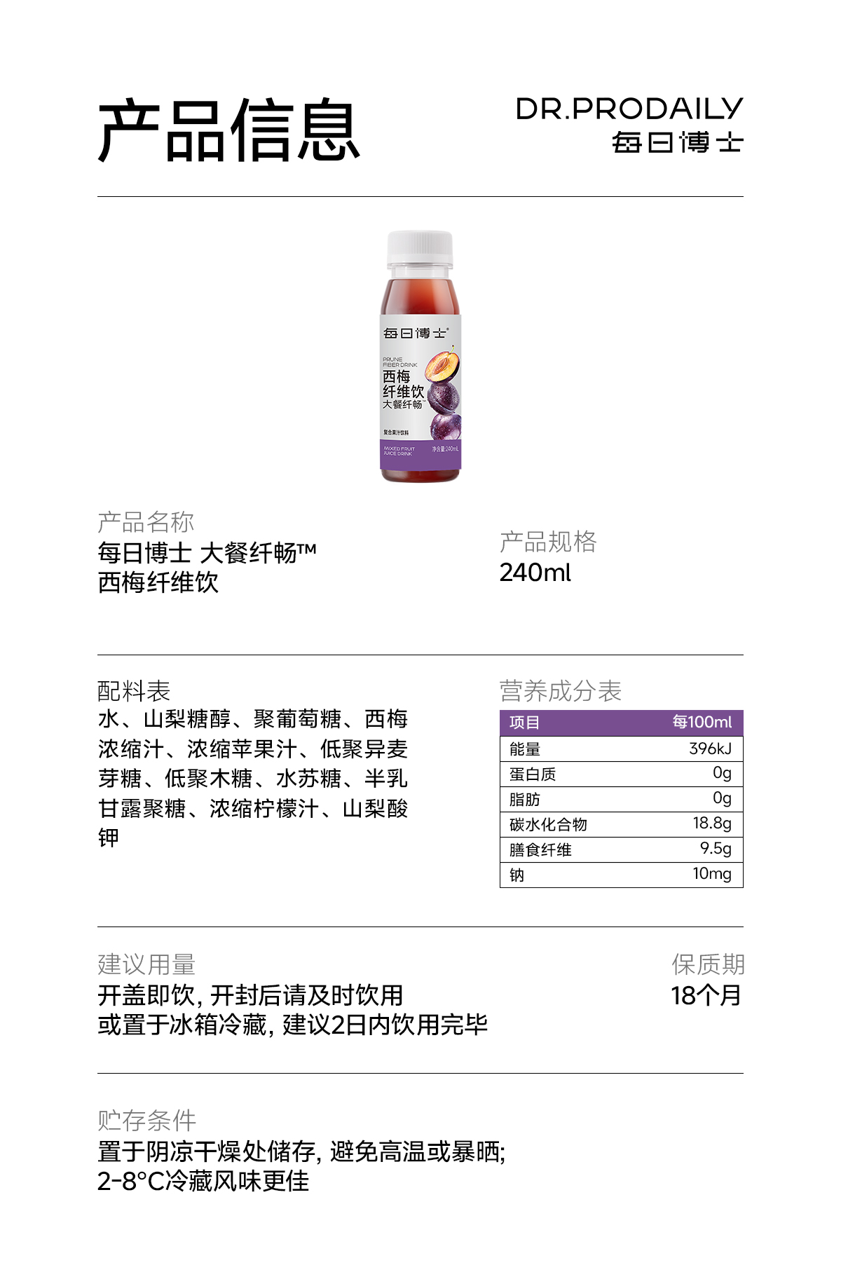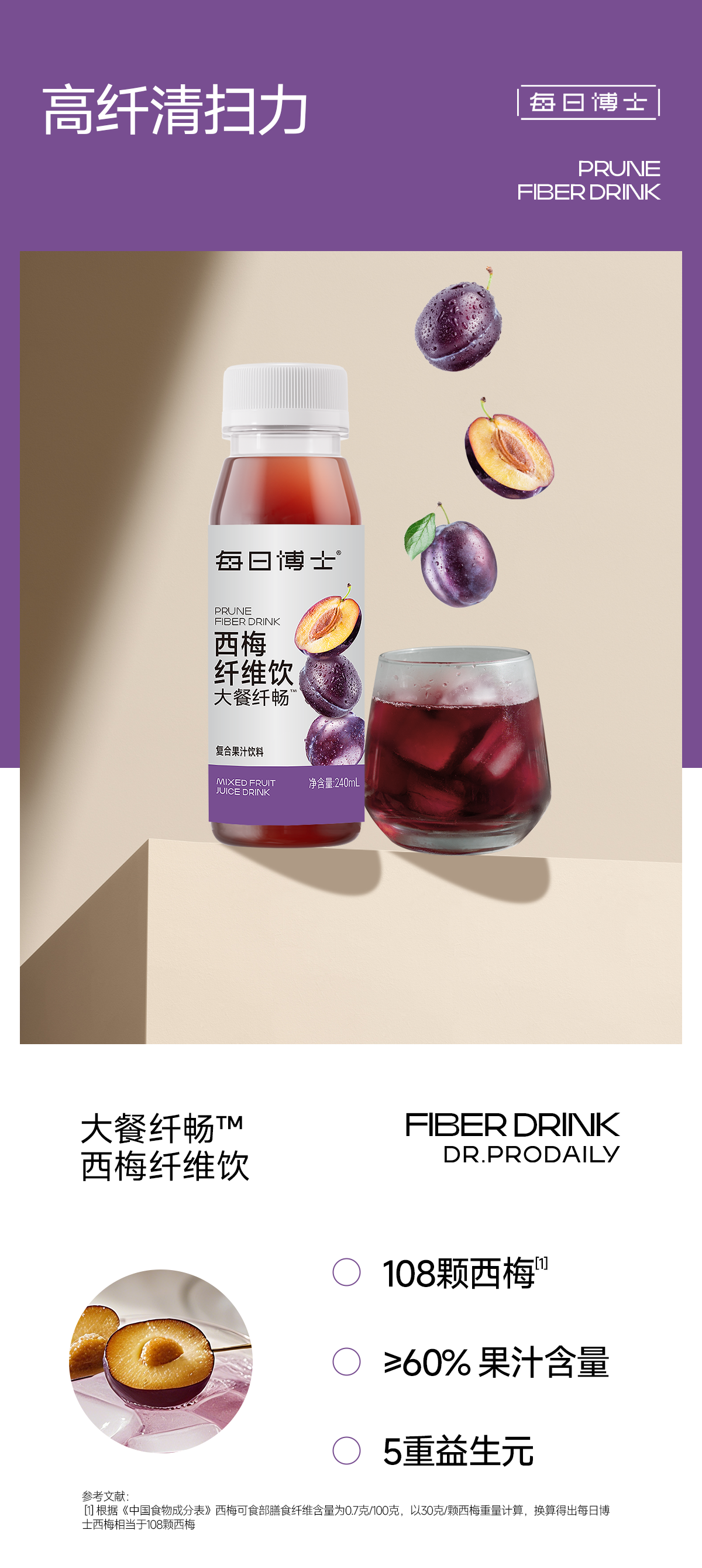西梅纤维饮 每条膳食纤维含量约等于108颗西梅,果汁含量≥60%。精选智利进口西梅为核心助排成分,并添加5重益生元,专研大餐纤畅配方,直击糖油碳,适合频繁油腻大餐的人群。