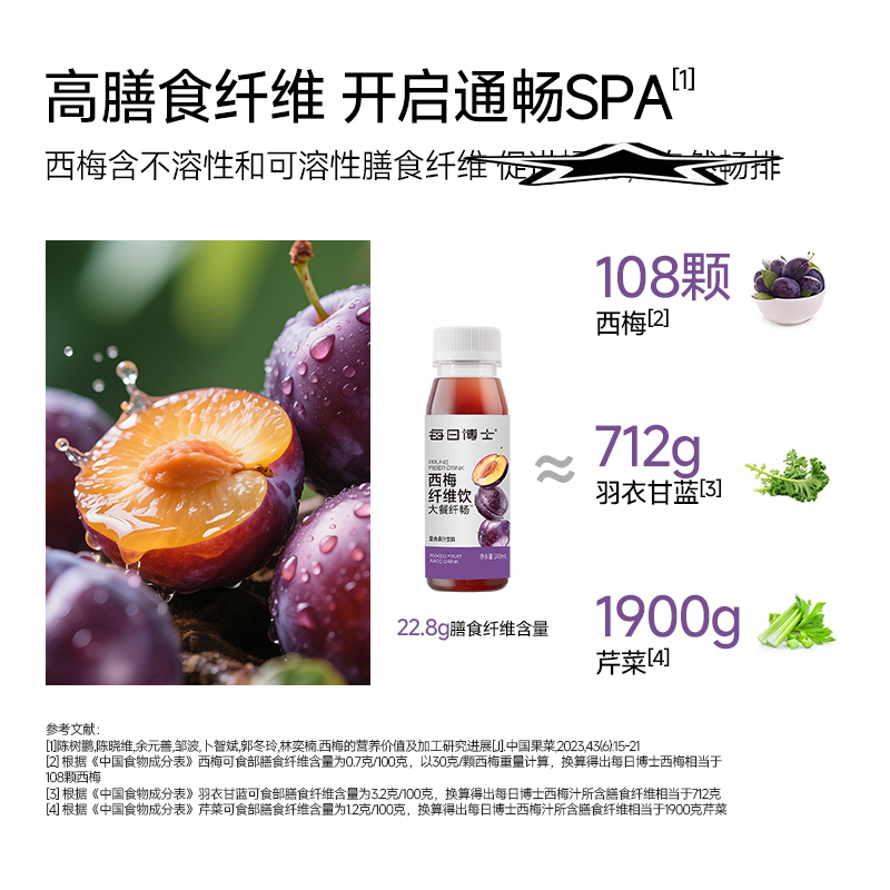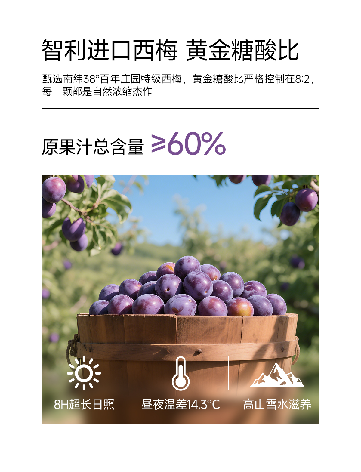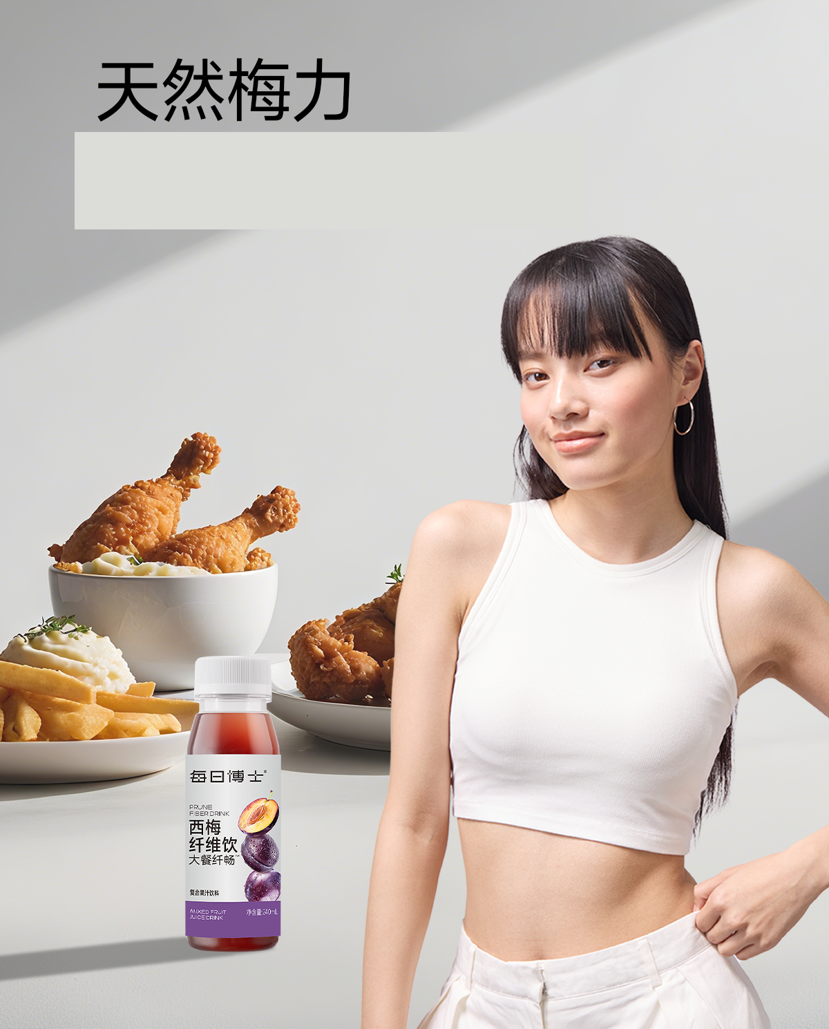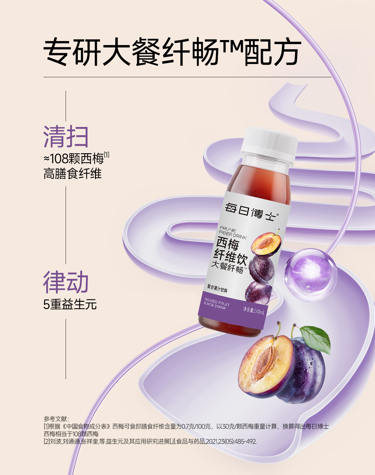 西梅纤维饮 每条膳食纤维含量约等于108颗西梅,果汁含量≥60%。精选智利进口西梅为核心助排成分,并添加5重益生元,专研大餐纤畅配方,直击糖油碳,适合频繁油腻大餐的人群。