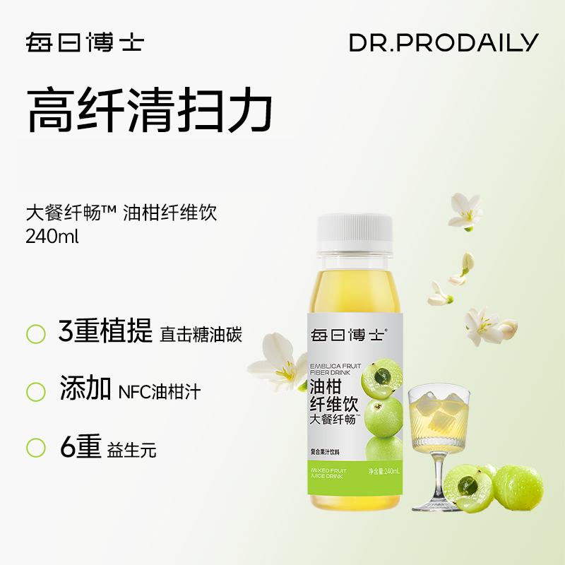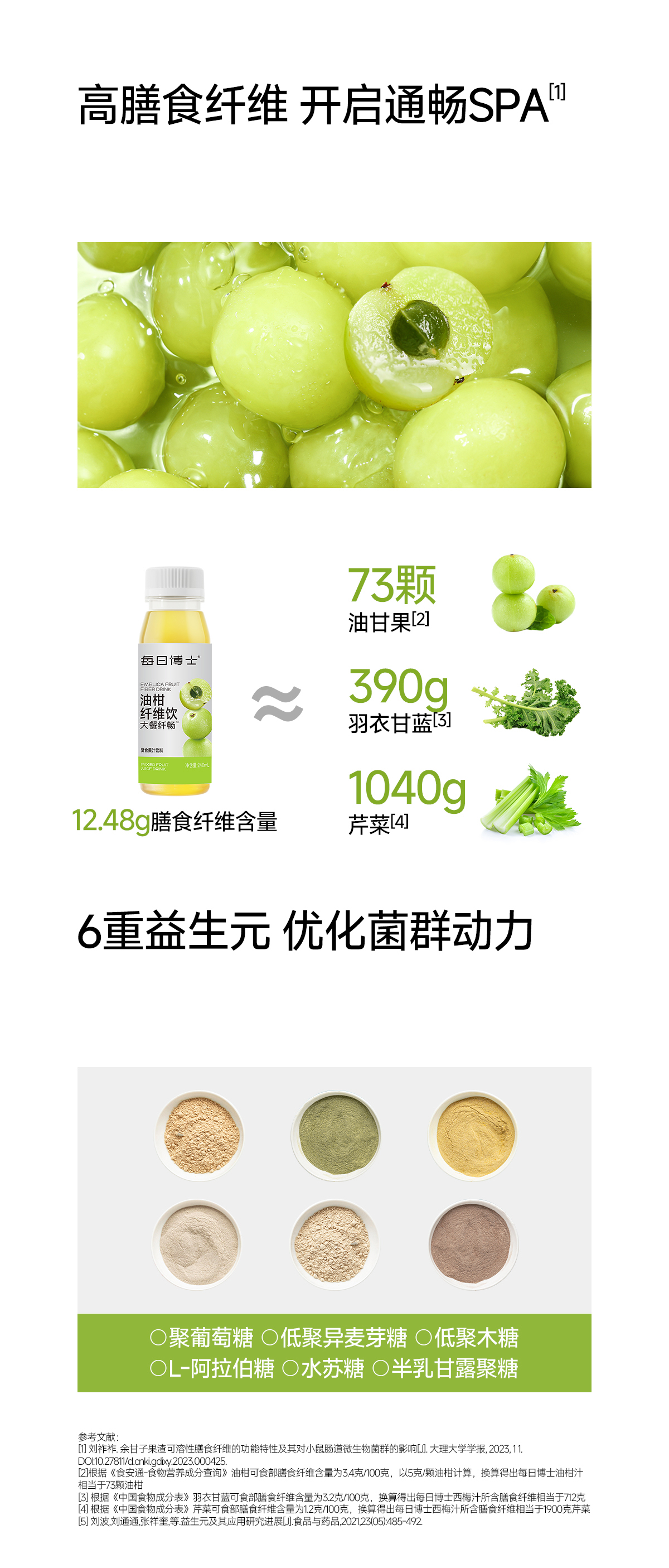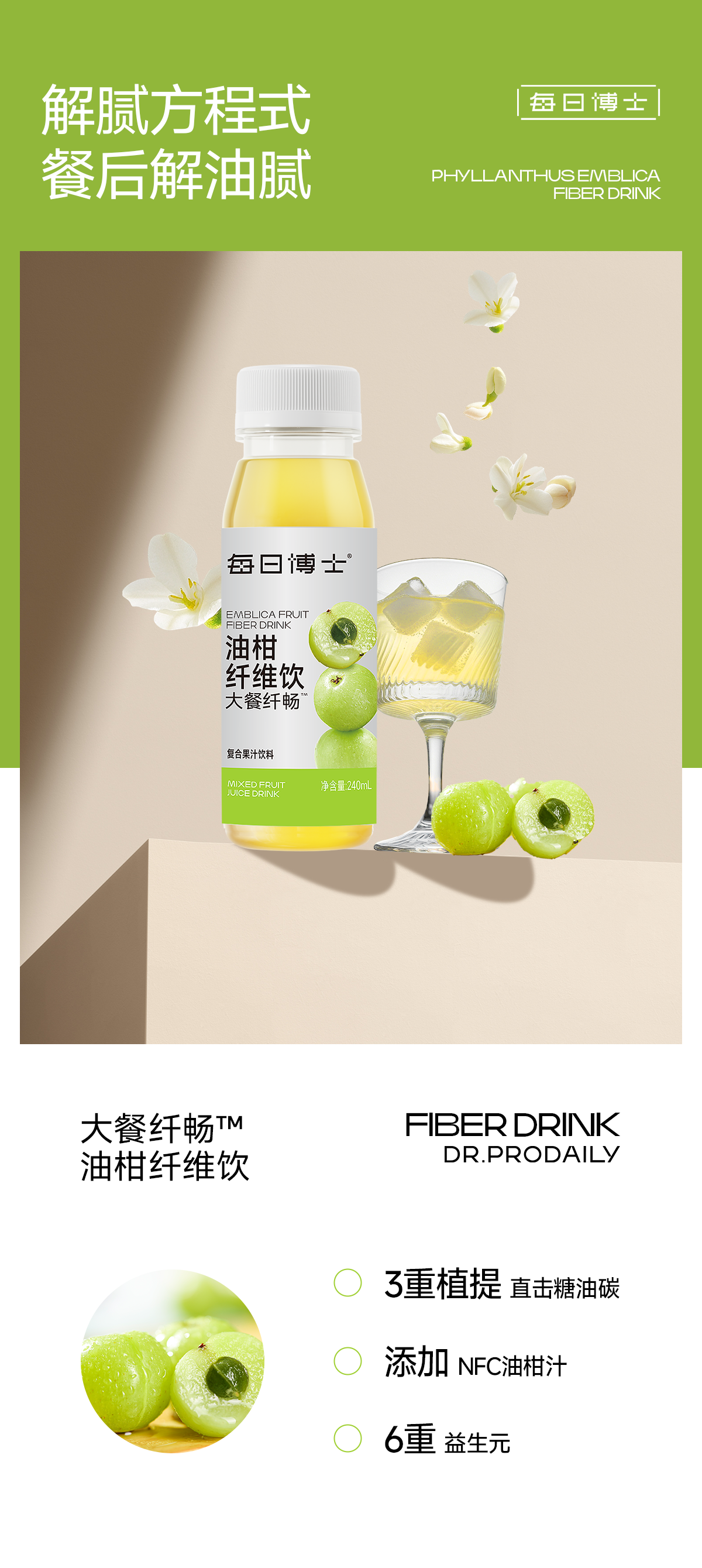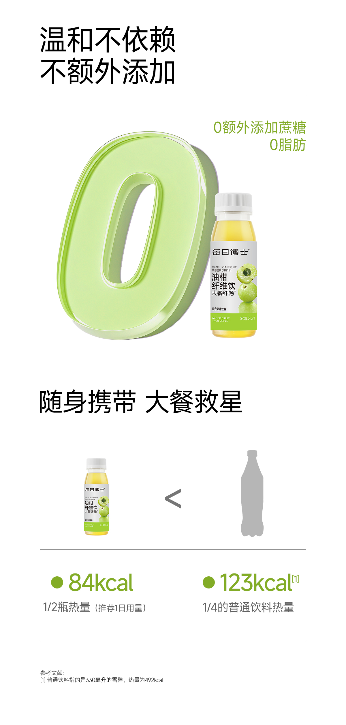 油柑纤维饮 每条膳食纤维含量约等于73颗油柑,并添加了NFC油柑汁,同时复配双胞菇、白芸豆、L-阿拉伯糖等助排成分与6重益生元,专研大餐纤畅配方,直击糖油碳。