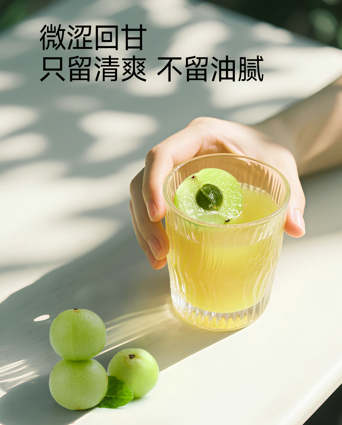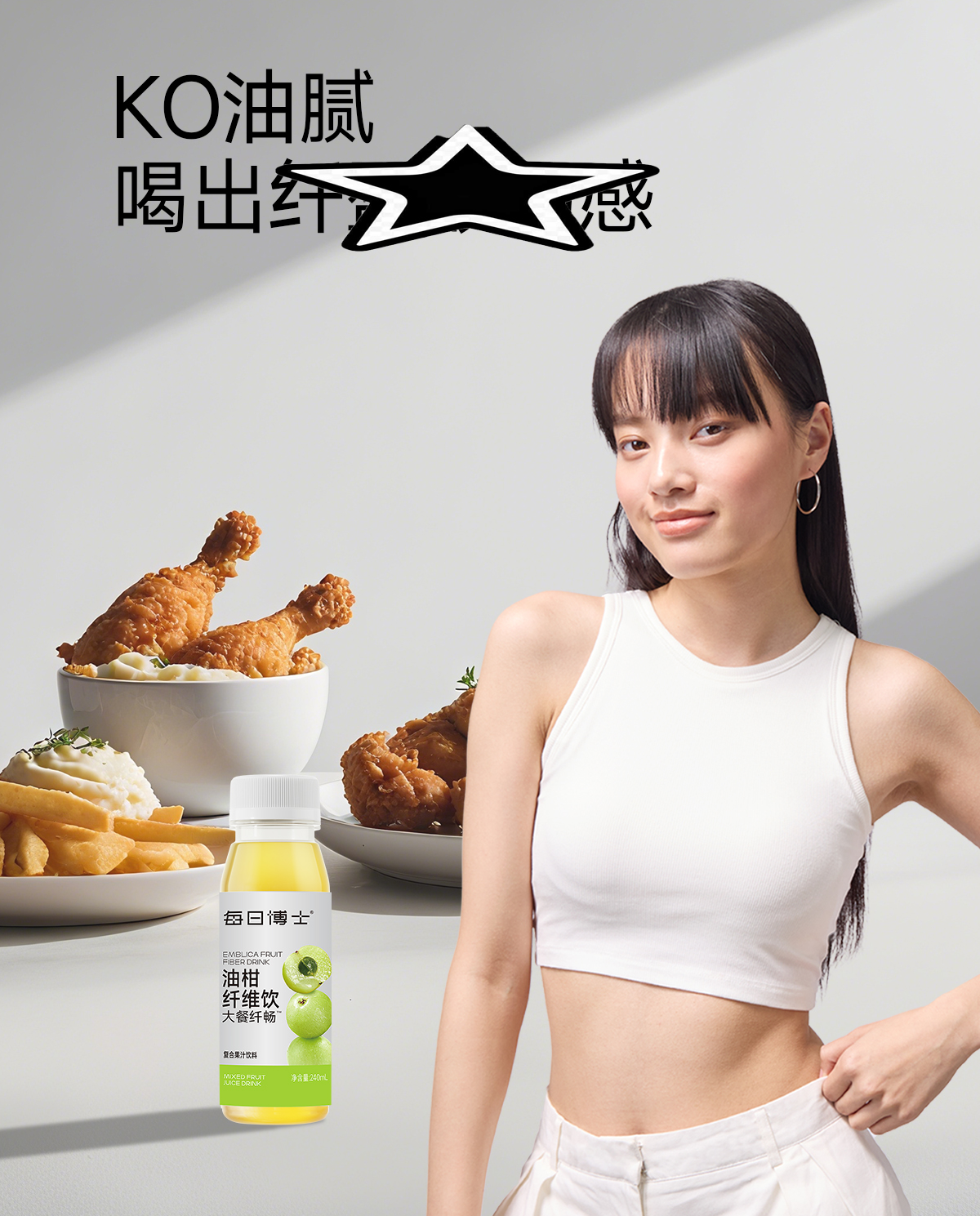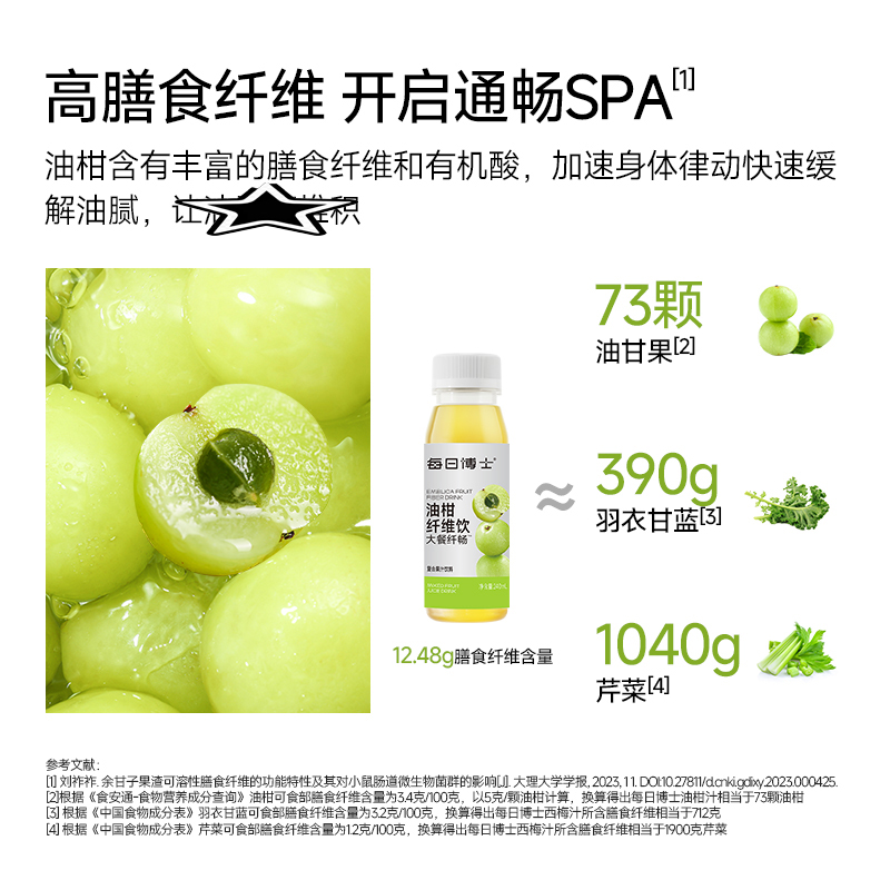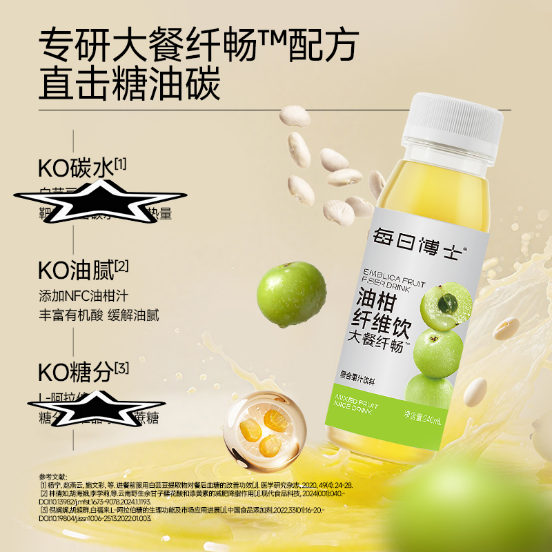 油柑纤维饮 每条膳食纤维含量约等于73颗油柑,并添加了NFC油柑汁,同时复配双胞菇、白芸豆、L-阿拉伯糖等助排成分与6重益生元,专研大餐纤畅配方,直击糖油碳。