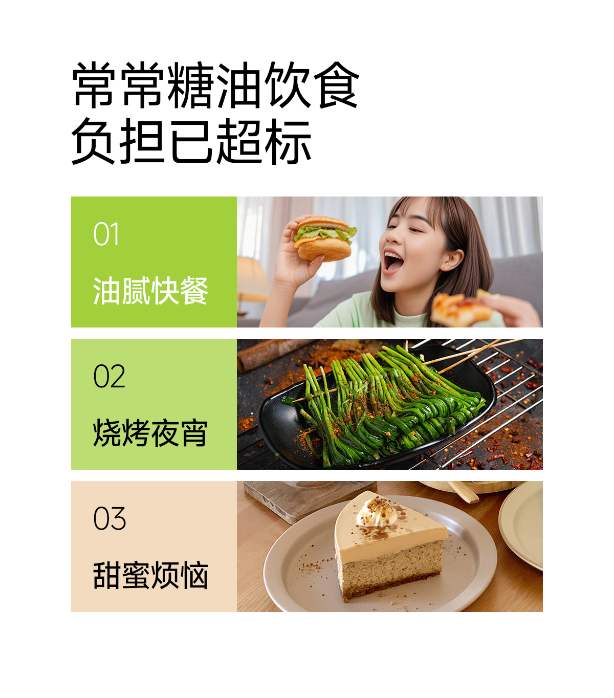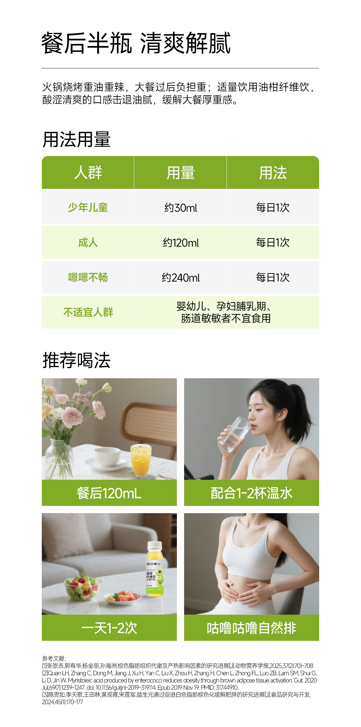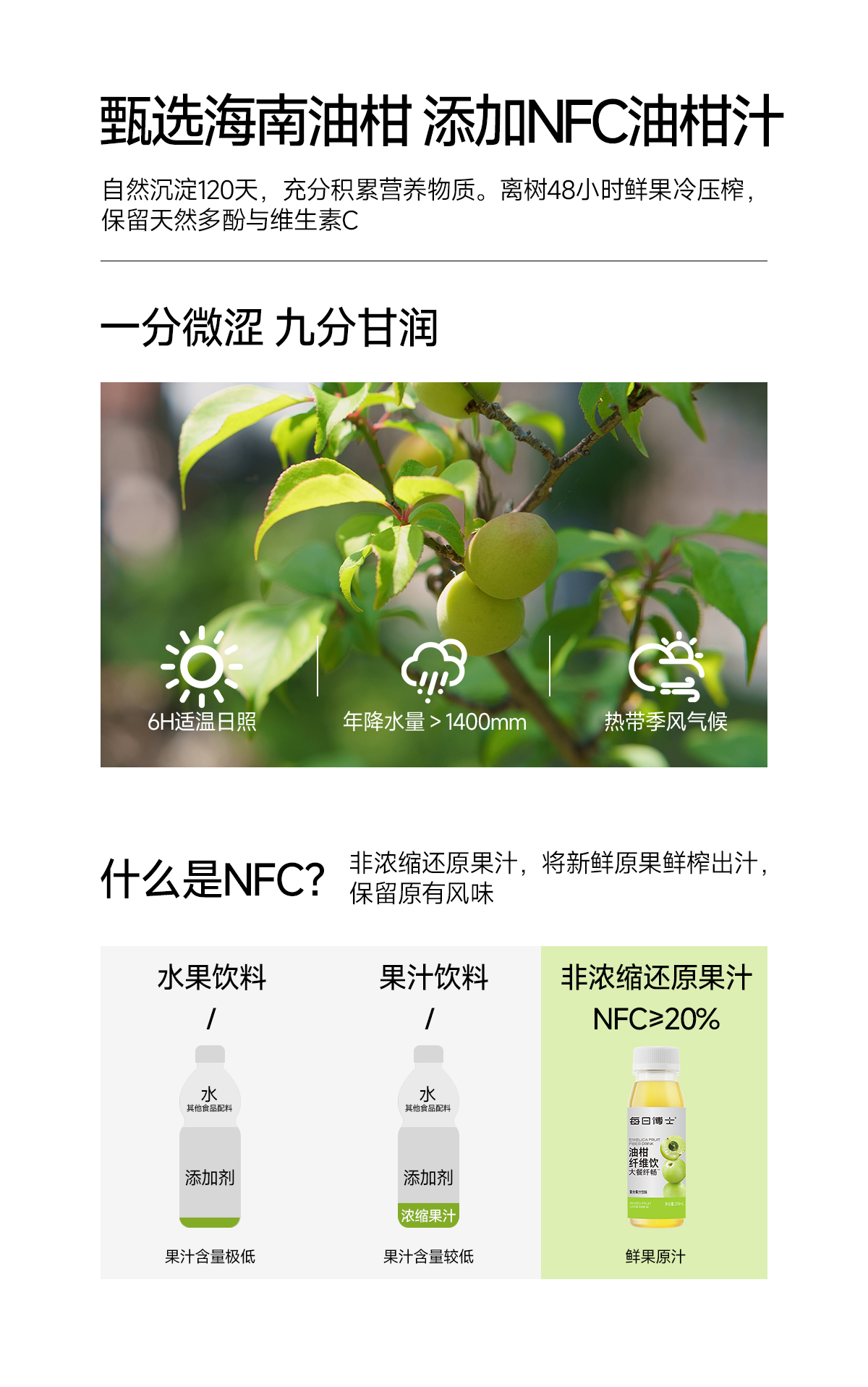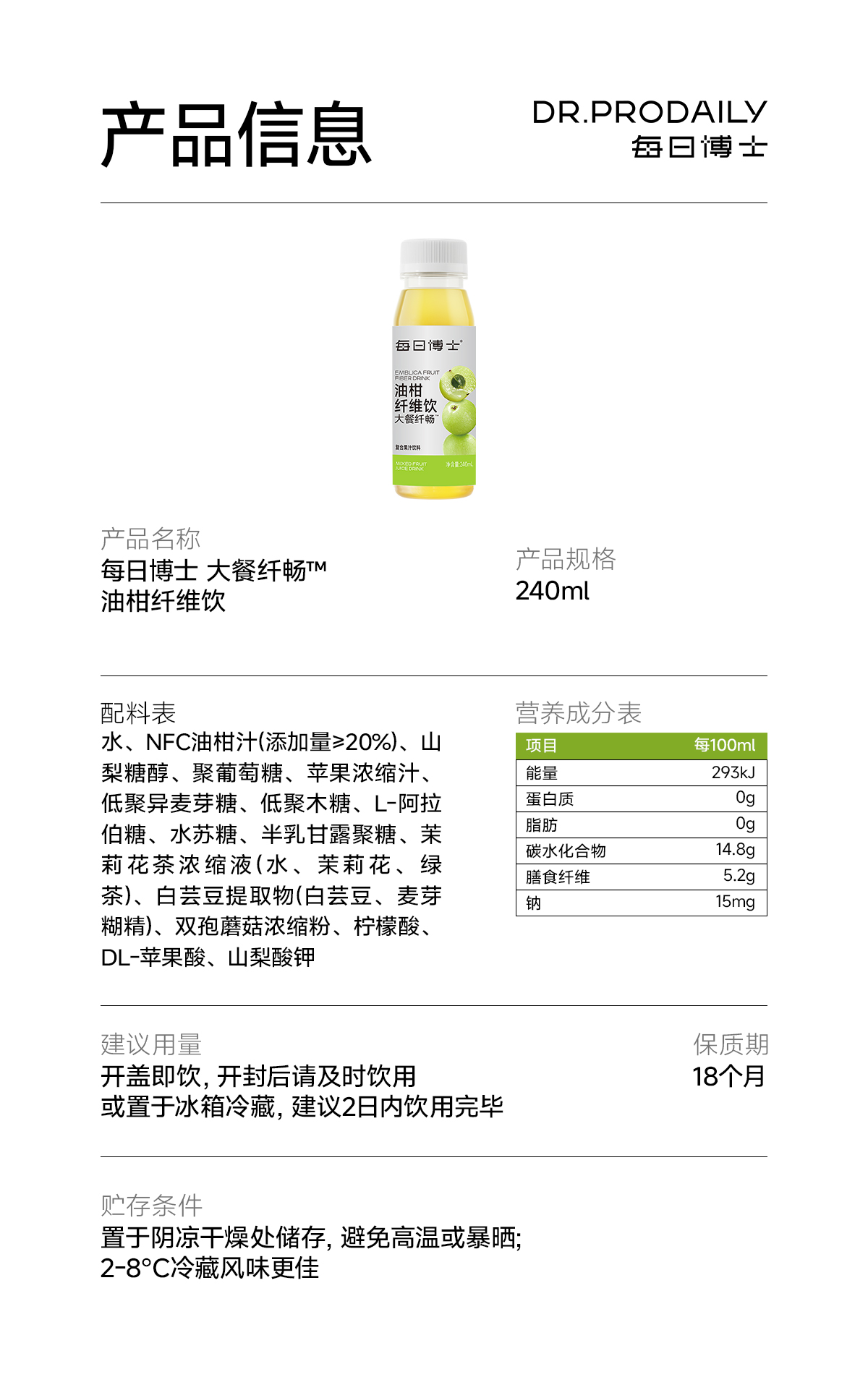 油柑纤维饮 每条膳食纤维含量约等于73颗油柑,并添加了NFC油柑汁,同时复配双胞菇、白芸豆、L-阿拉伯糖等助排成分与6重益生元,专研大餐纤畅配方,直击糖油碳。