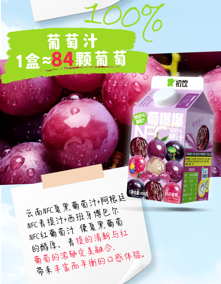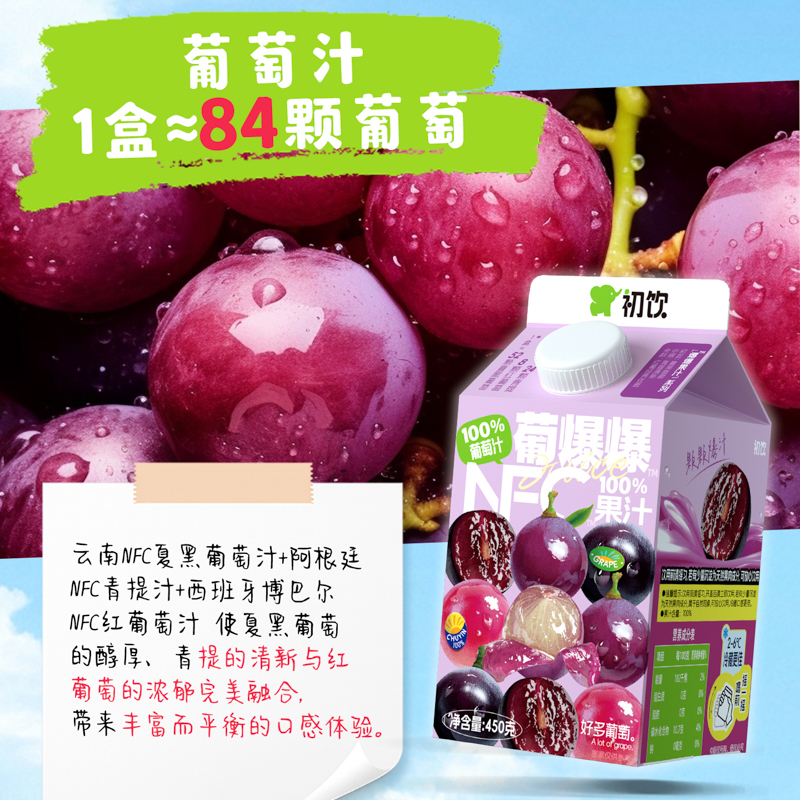 - 三重葡萄汁复合配比:云南NFC夏黑葡萄汁+阿根廷NFC青提汁+西班牙博巴尔NFC红葡萄汁