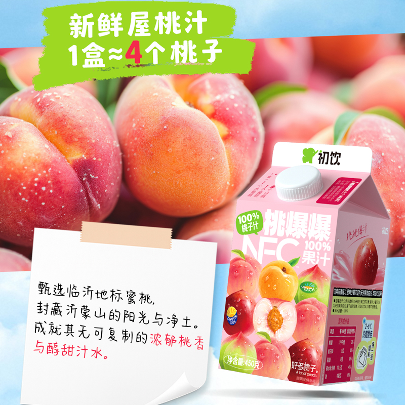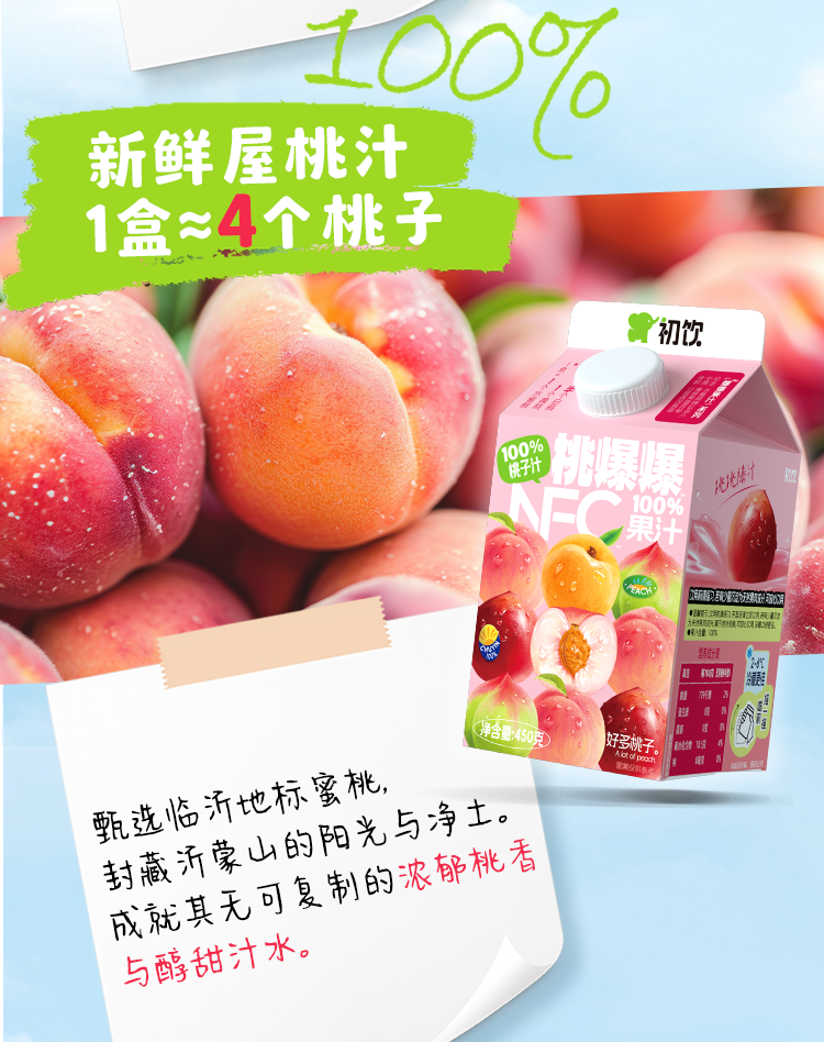 - 双桃融合:山东蒙阴NFC蜜桃汁+黄金秀黄桃原浆+久保白桃原浆
