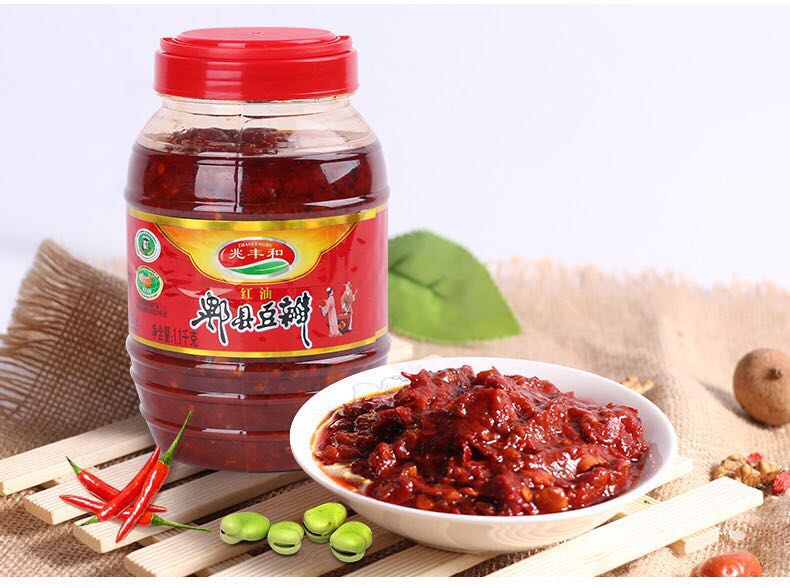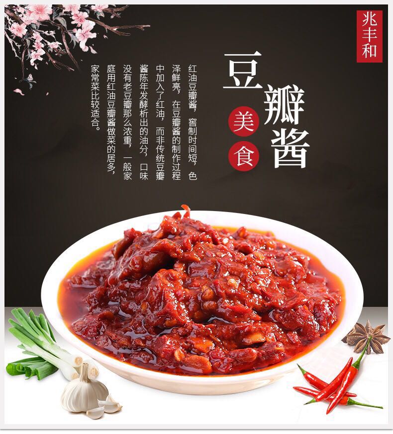 兆丰和郫县红油豆瓣位于四川郫县,是四川省郫县豆瓣特产,中国地理标志产品。是四川三大名瓣之一。选材工艺独树一帜,与从不同。香味醇厚未加一点香料,色泽油润未加任何油脂,全靠精细的加工技术和原料的优良而达到色、香,味俱佳,具有辣味重、鲜红油润、回味香甜的特点。