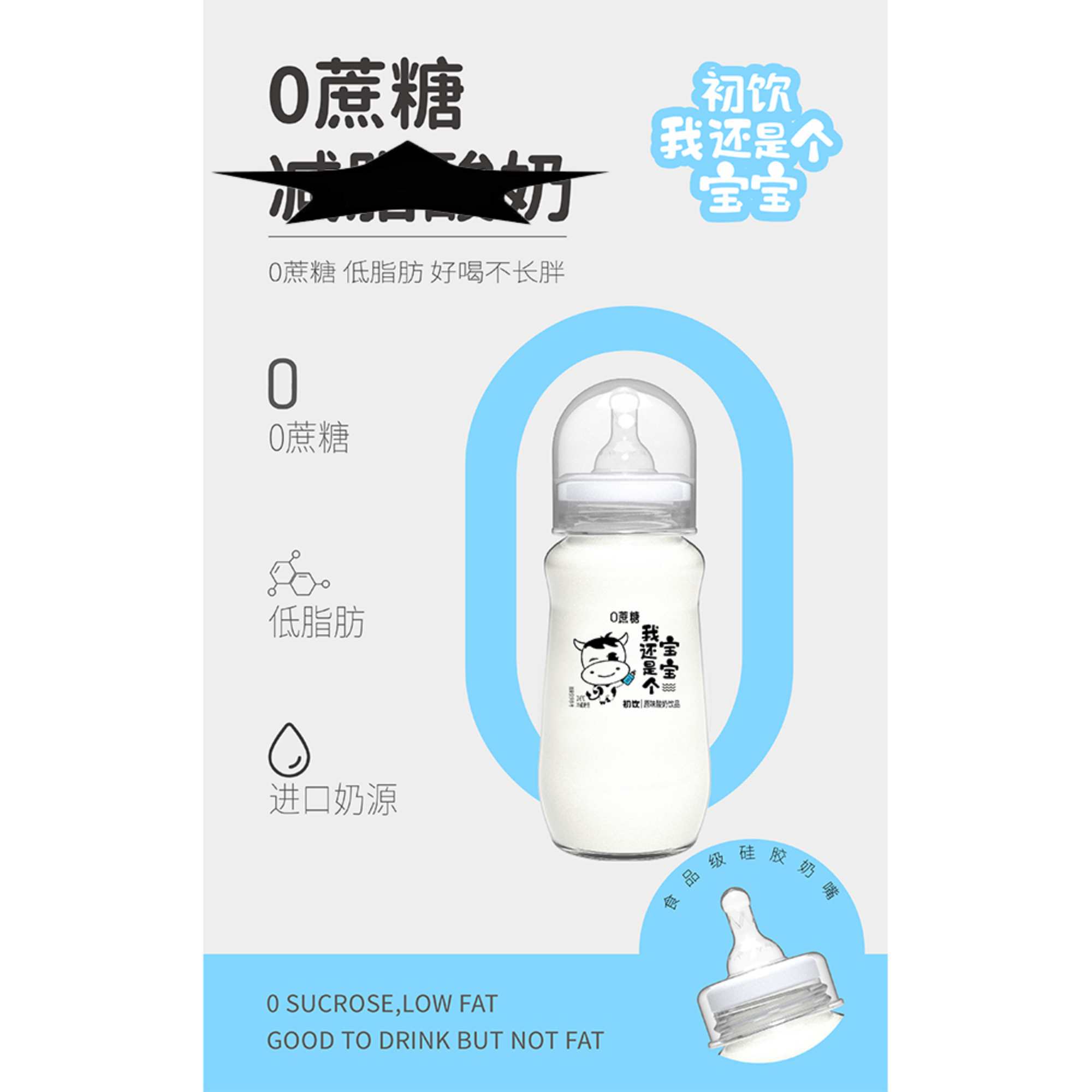 ·食品级硅胶奶嘴 + 玻璃瓶身,还原宝宝奶瓶造型,可爱吸睛,自带社交属性,吸引消费者拍照分享。