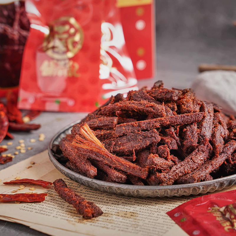 - 产品采用六代传承古法制作技艺融合现代科技加工,制作工艺遵循百年传承,手工炒制,让您吮指留香,意犹未尽。精选新西兰***草饲牛后大腿部位,只为保留牛肉劲道十足的口感,孕育**质的上层美味。