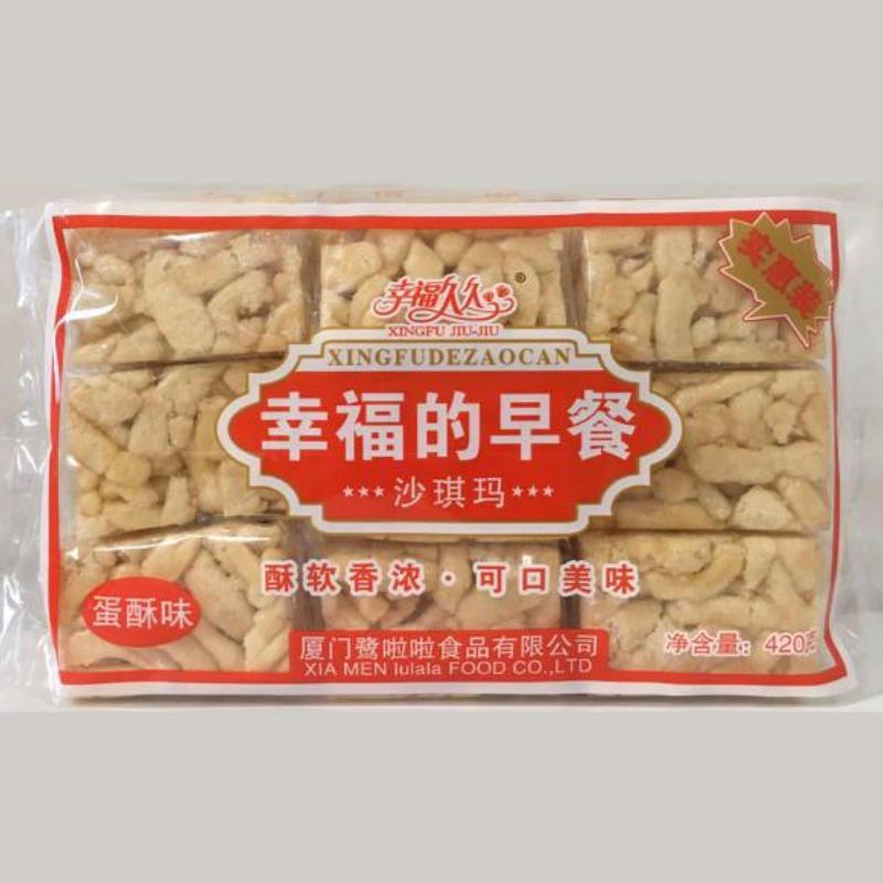 420沙琪玛口感松软,质量上层,有蛋酥味、黑糖味、葡萄味,零售9或10元。