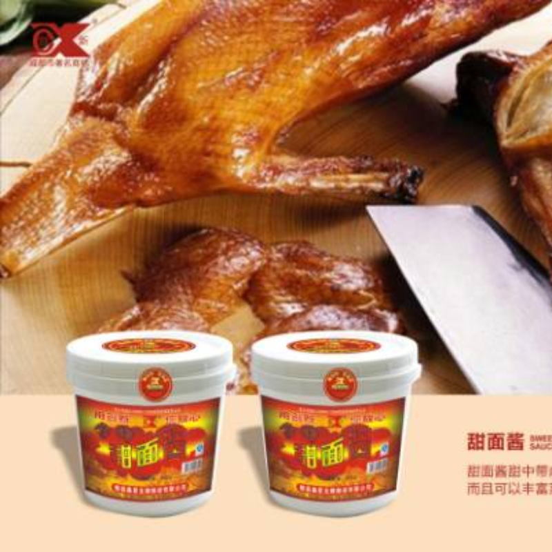 甜面酱,又称甜酱,是以面粉为主要原料,经制曲和保温发酵制成的一种酱状调味品。其味甜中带咸,同时有酱香和酯香,适用于烹饪酱爆和酱烧菜,如“酱爆肉丁”等,还可蘸食大葱、黄瓜、烤鸭等菜品。