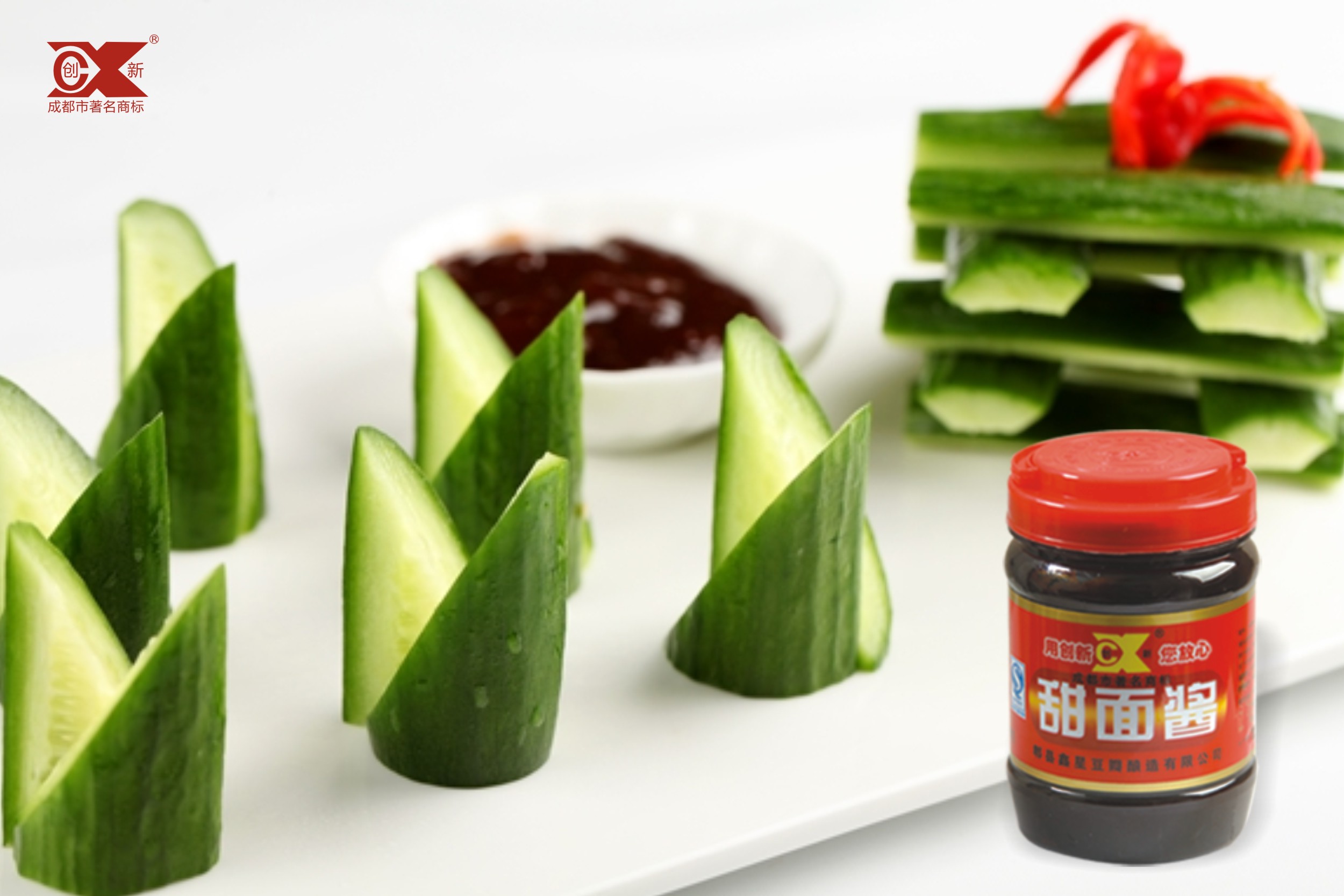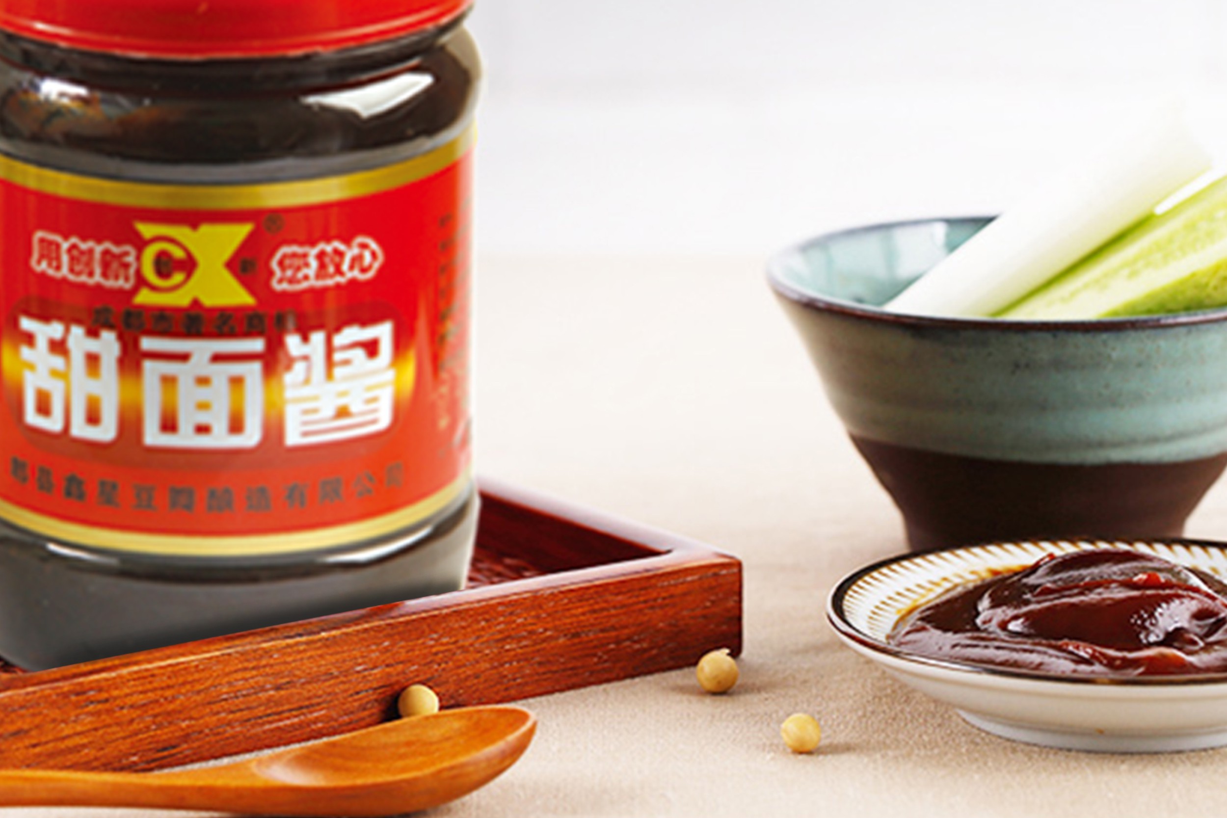 甜面酱,又称甜酱,是以面粉为主要原料,经制曲和保温发酵制成的一种酱状调味品。其味甜中带咸,同时有酱香和酯香,适用于烹饪酱爆和酱烧菜,如“酱爆肉丁”等,还可蘸食大葱、黄瓜、烤鸭等菜品。
