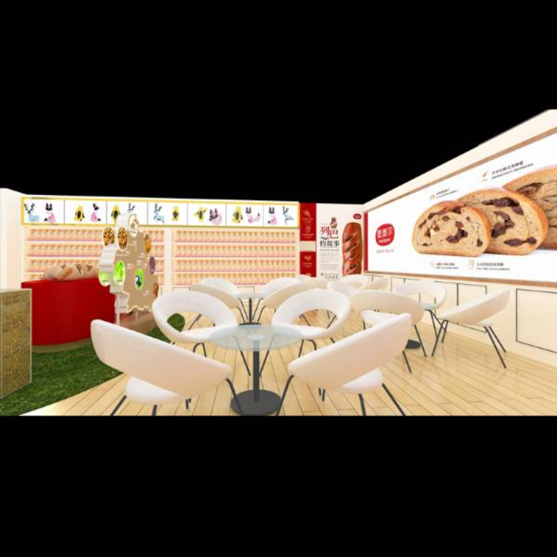 该图为天津瑞吉酒店二楼90平方米的新疆麦趣尔展厅。此位置仅有一个门作为出入口,墙体较多,我们为麦趣尔设定了以产品为核心导向的,画面为展示主体的设计思路。墙体采用大幅产品画面灯箱,简单直接将内容推至观众眼前。展厅内置一个精品展示区域,中间放置新疆地图的异形灯箱,配上仿真草皮及精品展柜,营造了美轮美奂的企业文化+精品产品的综合造型。