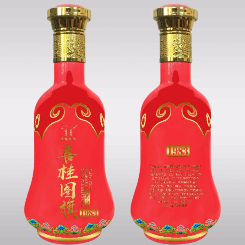 产品瓶身采用透明红色瓶子,蒙古特色图案,彰显地域色彩,适合宴会使用。