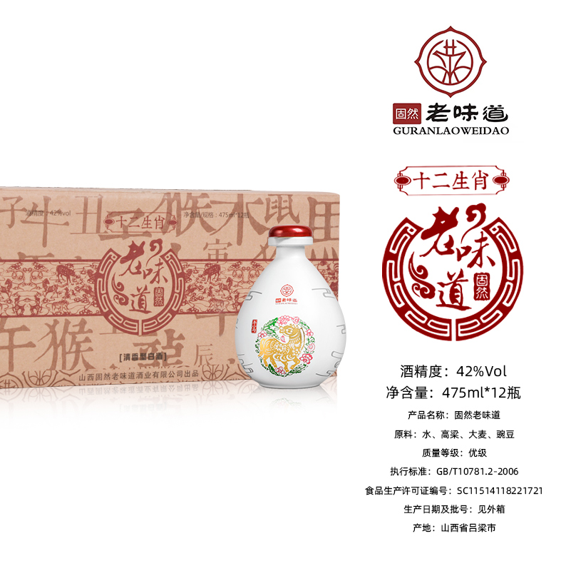 这是一款消费性的大众酒,它结合了我国传统的生肖元素,适合每个消费者的需求,而且在设计上运用了小坛瓶型,复古美观大气,陈列效果极好,给人耳目一新的感觉。酒体出自于山西杏花村,由汾酒酿酒大师勾调,纯粮酿造,酒体醇厚,入口甘甜绵长。为了适应更多的消费群体,我们选择了清香型白酒的常规度数42度,适应于日常饮用。