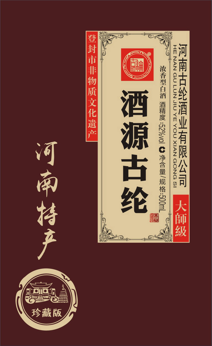 名称:酒源古纶 酒精度:52%vol 净含量:500ml*6瓶 香型:浓香型