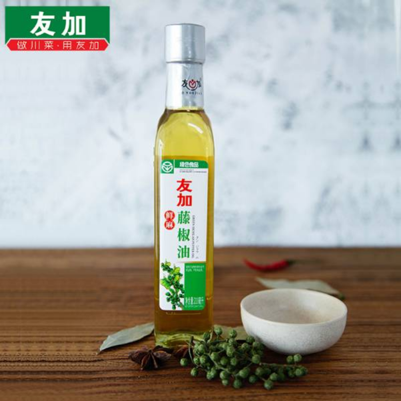 友加藤椒油选用友加汉源花椒基地青花椒萃取炼制而成,清香幽麻。