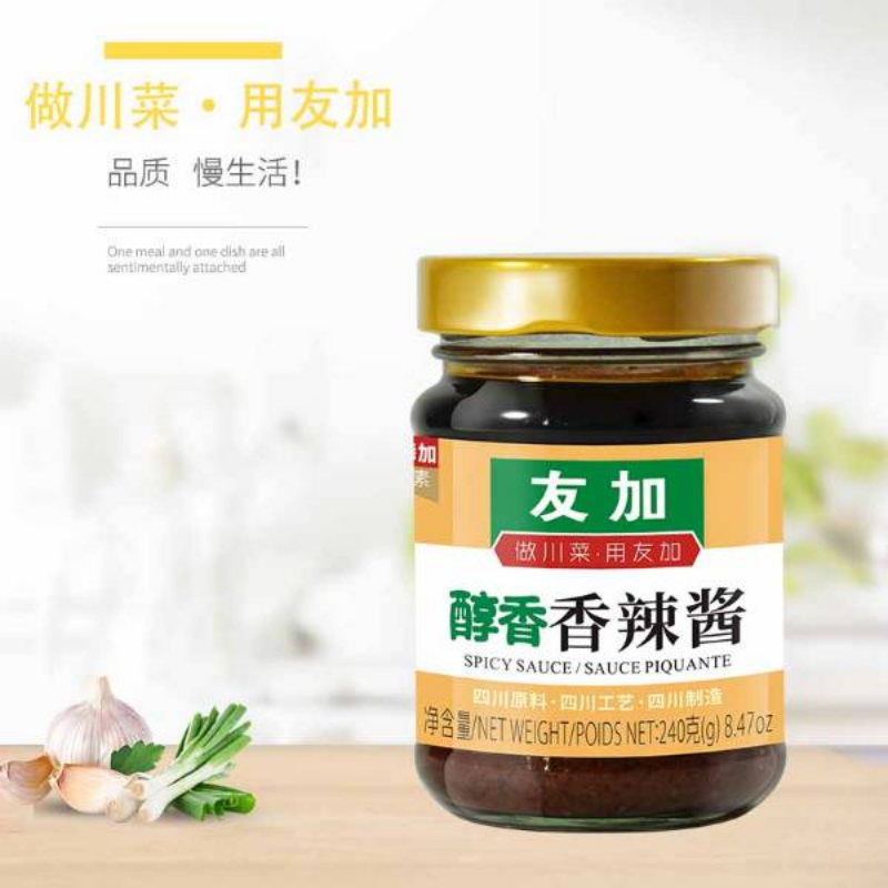 友加醇香香辣酱以自制陈年老豆瓣为基地,加以多种香辛原料用植物油炒制而成,香辣味浓,美味醇香。